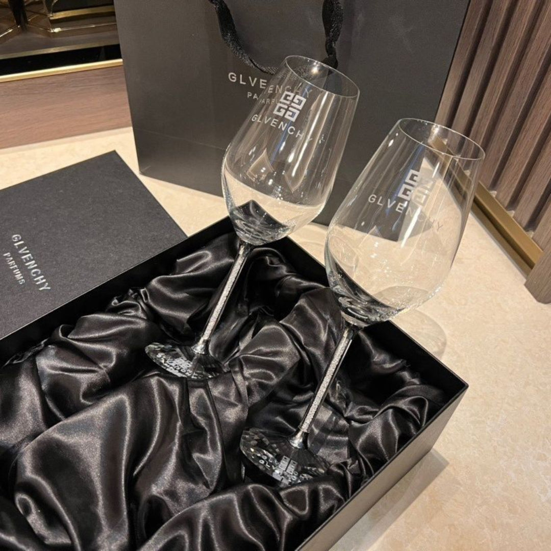 Elegant Givenchy wine glass set featuring two crystal-clear glasses with sleek, engraved stems.