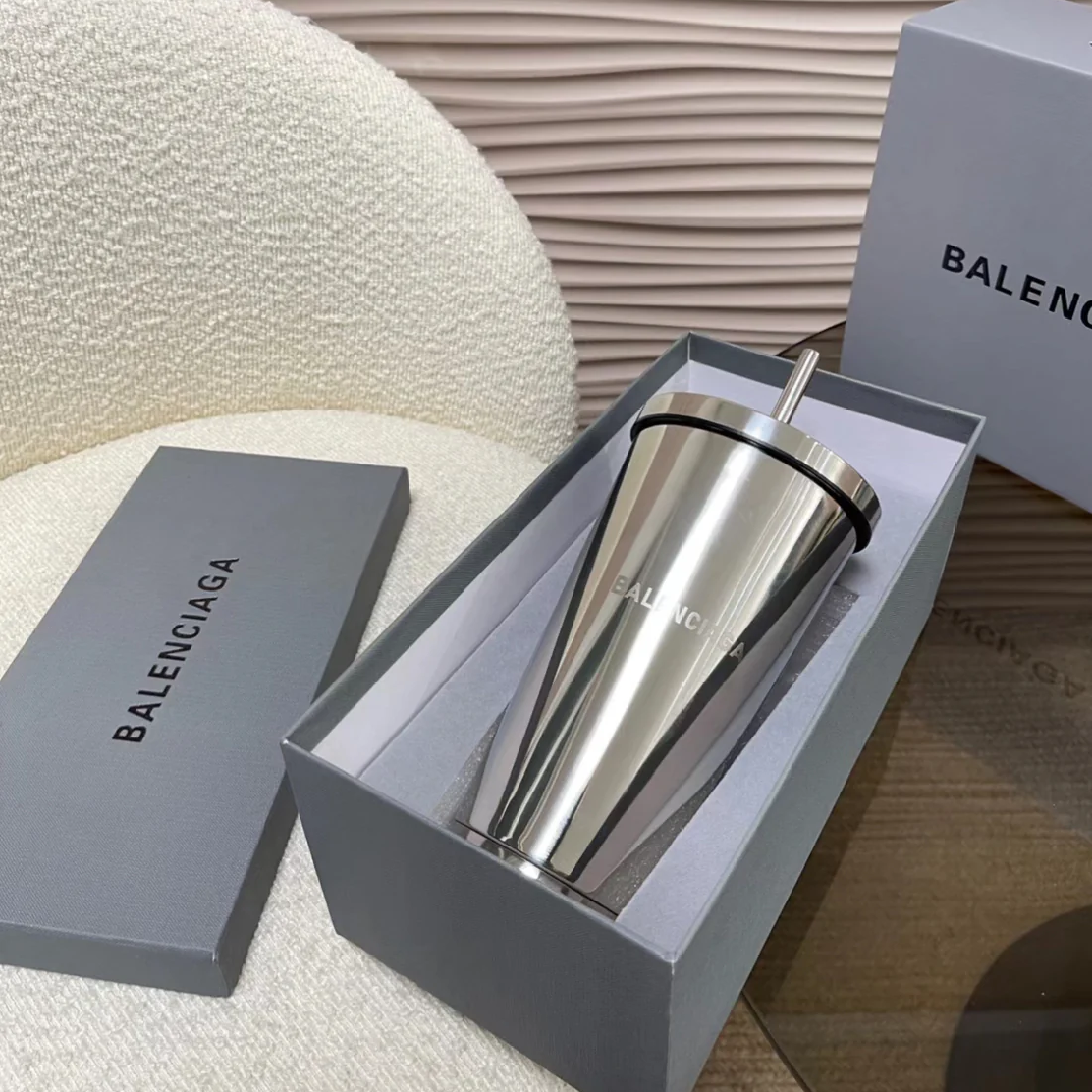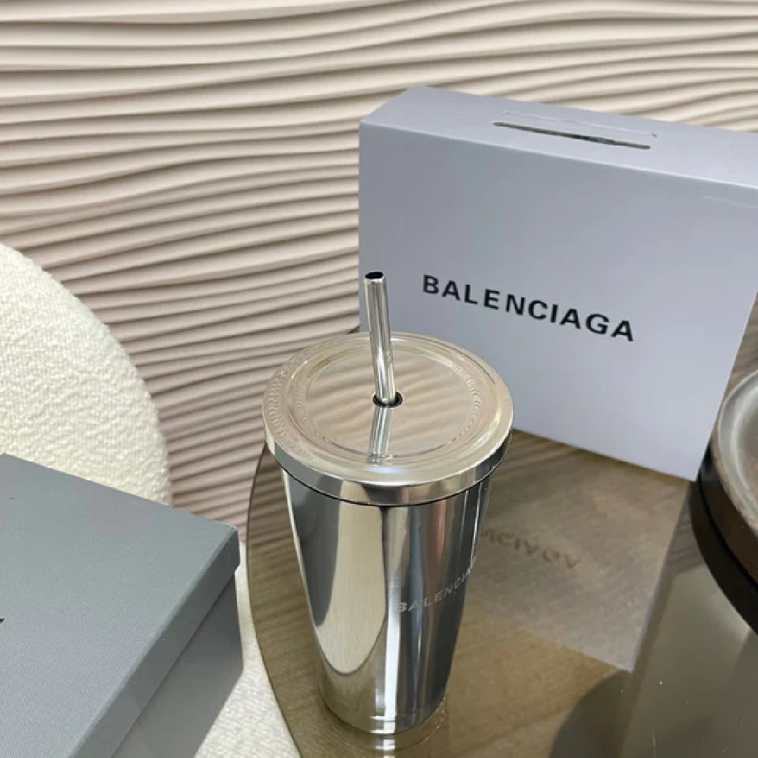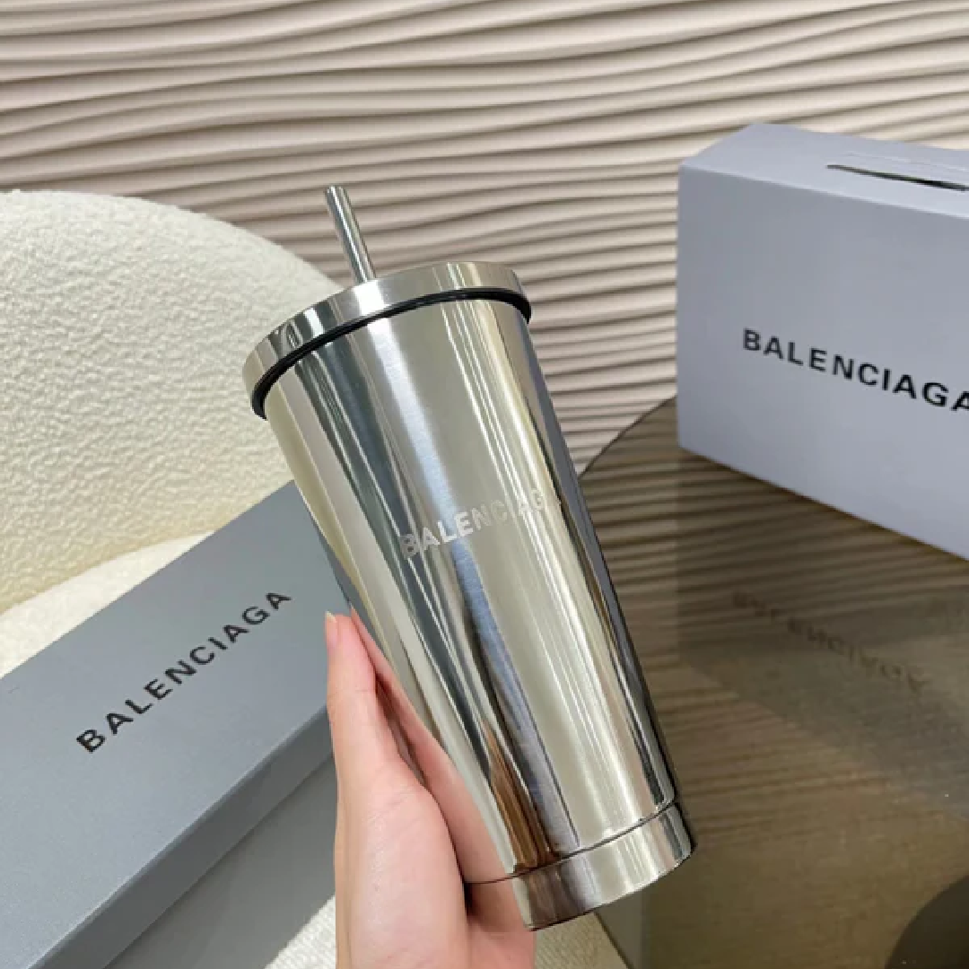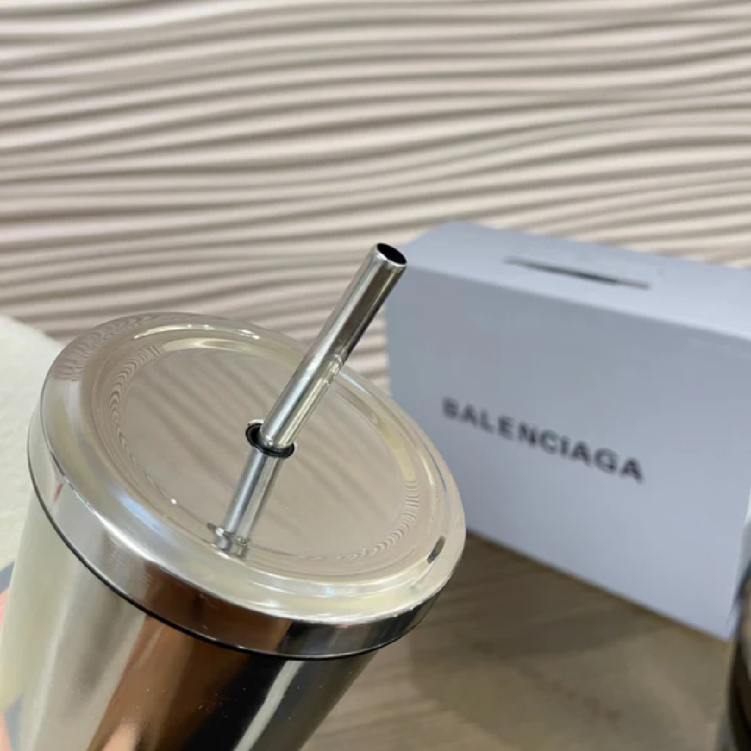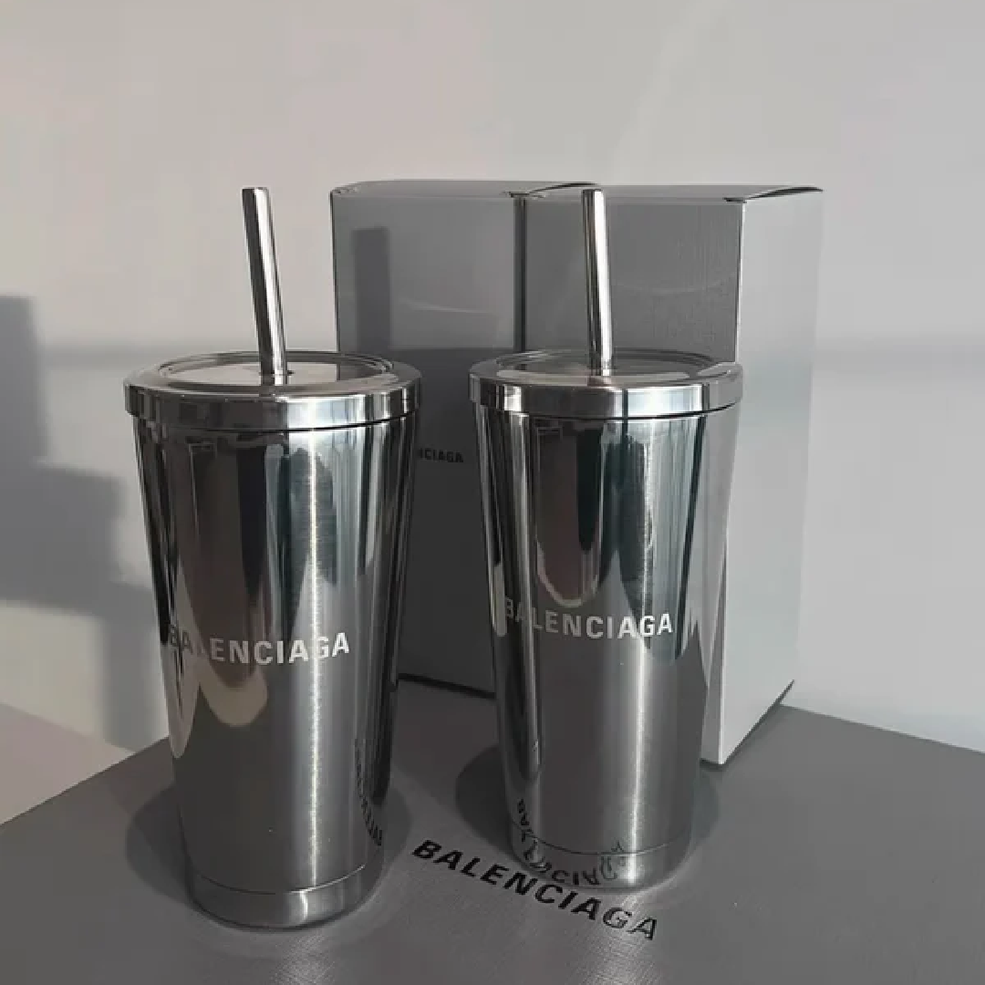 Luxurious stainless steel tumbler from Balenciaga with a matching metal straw—sleek, minimalist, and reusable.