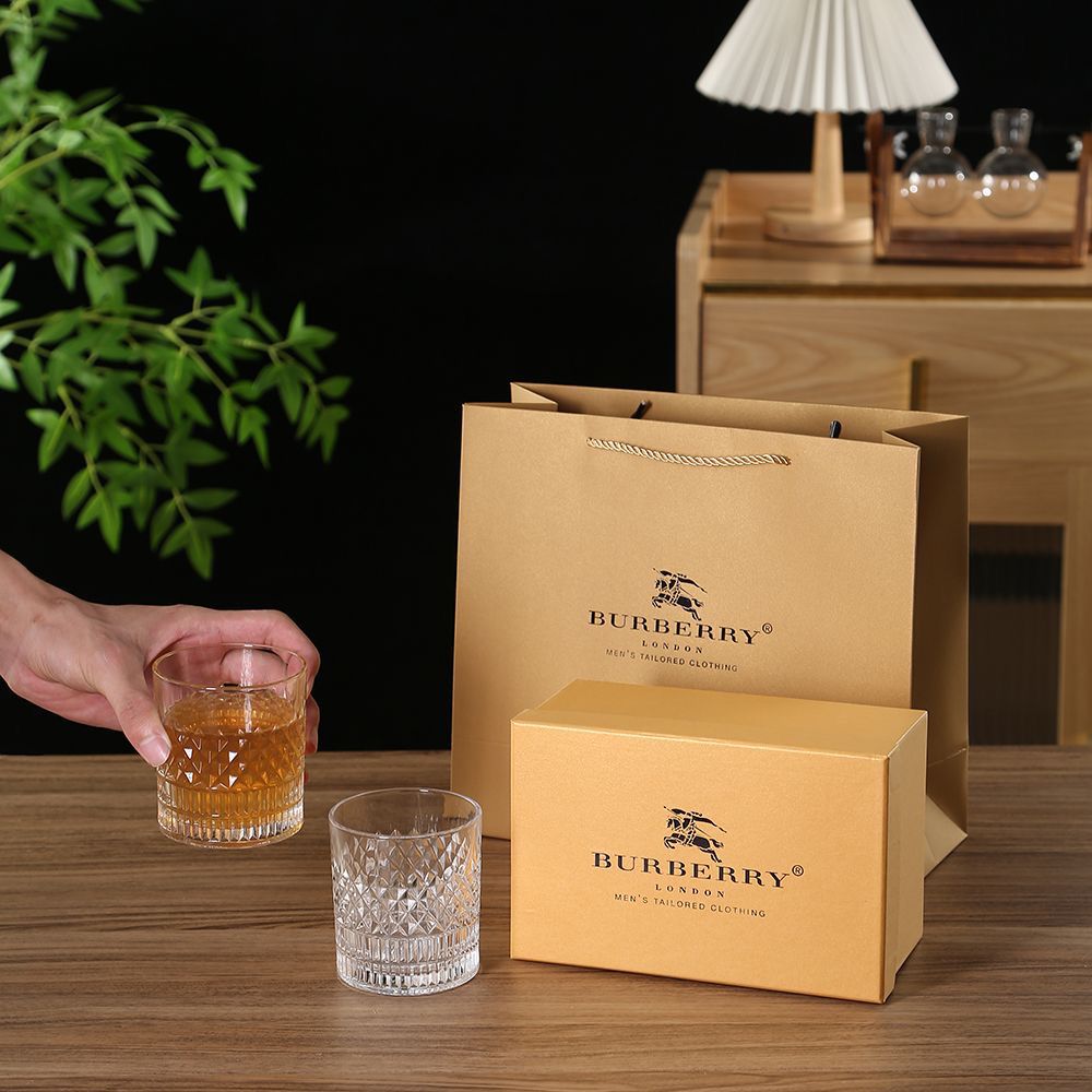 Luxurious Burberry gift set featuring two intricately cut crystal glasses in a golden satin-lined box.