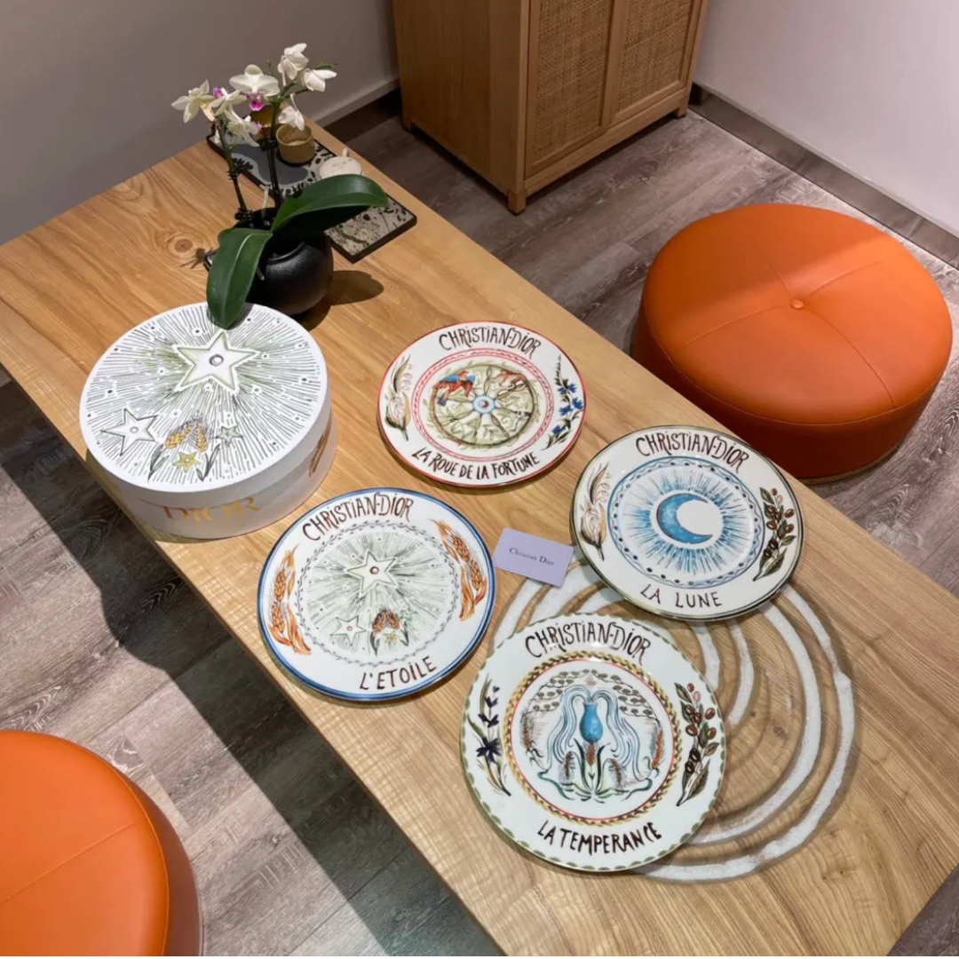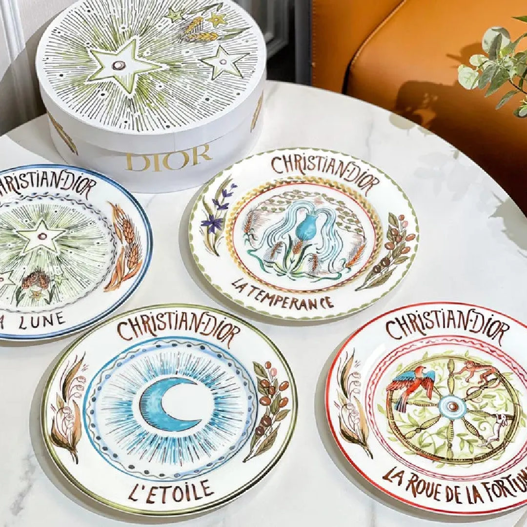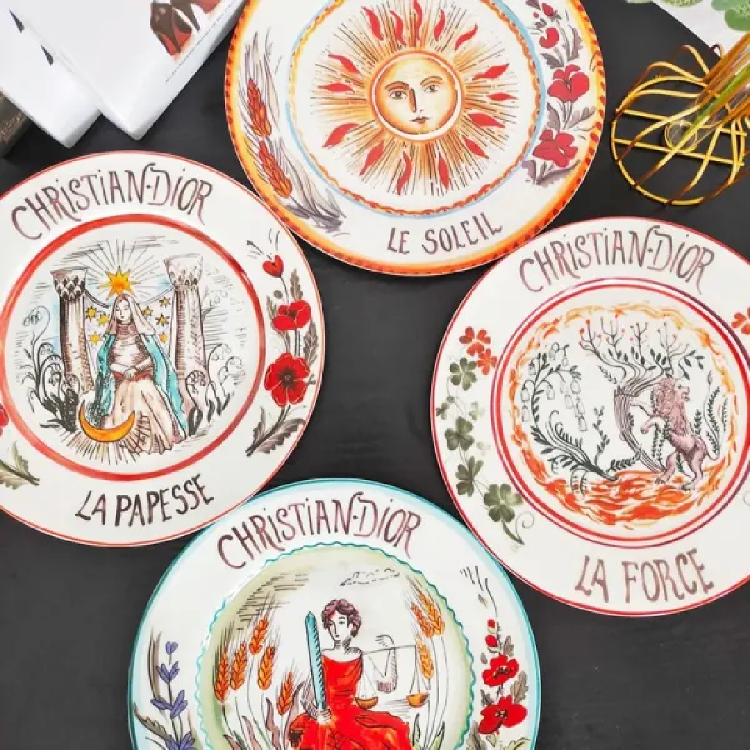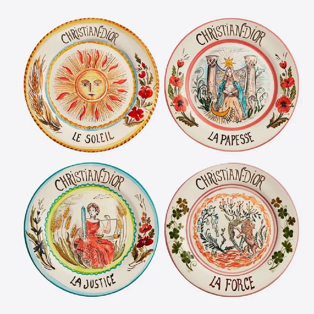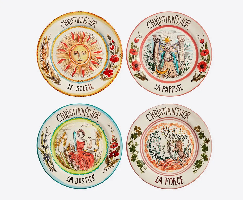 Christian Dior set of 8-inch & 10-inch Sun and Moon disks (4 pieces each) featuring vibrant, mystical Tarot-inspired hand-painted illustrations.