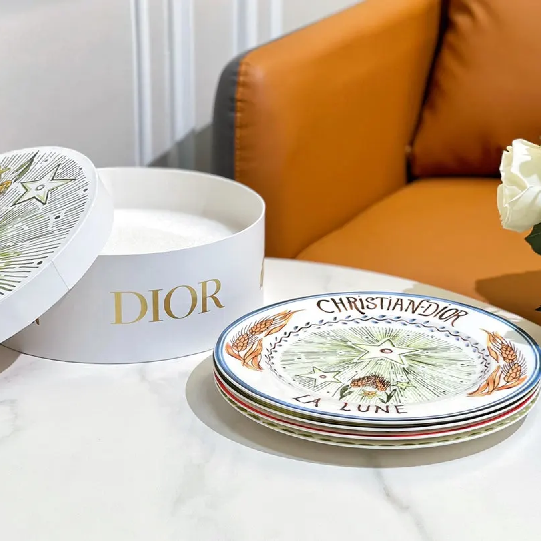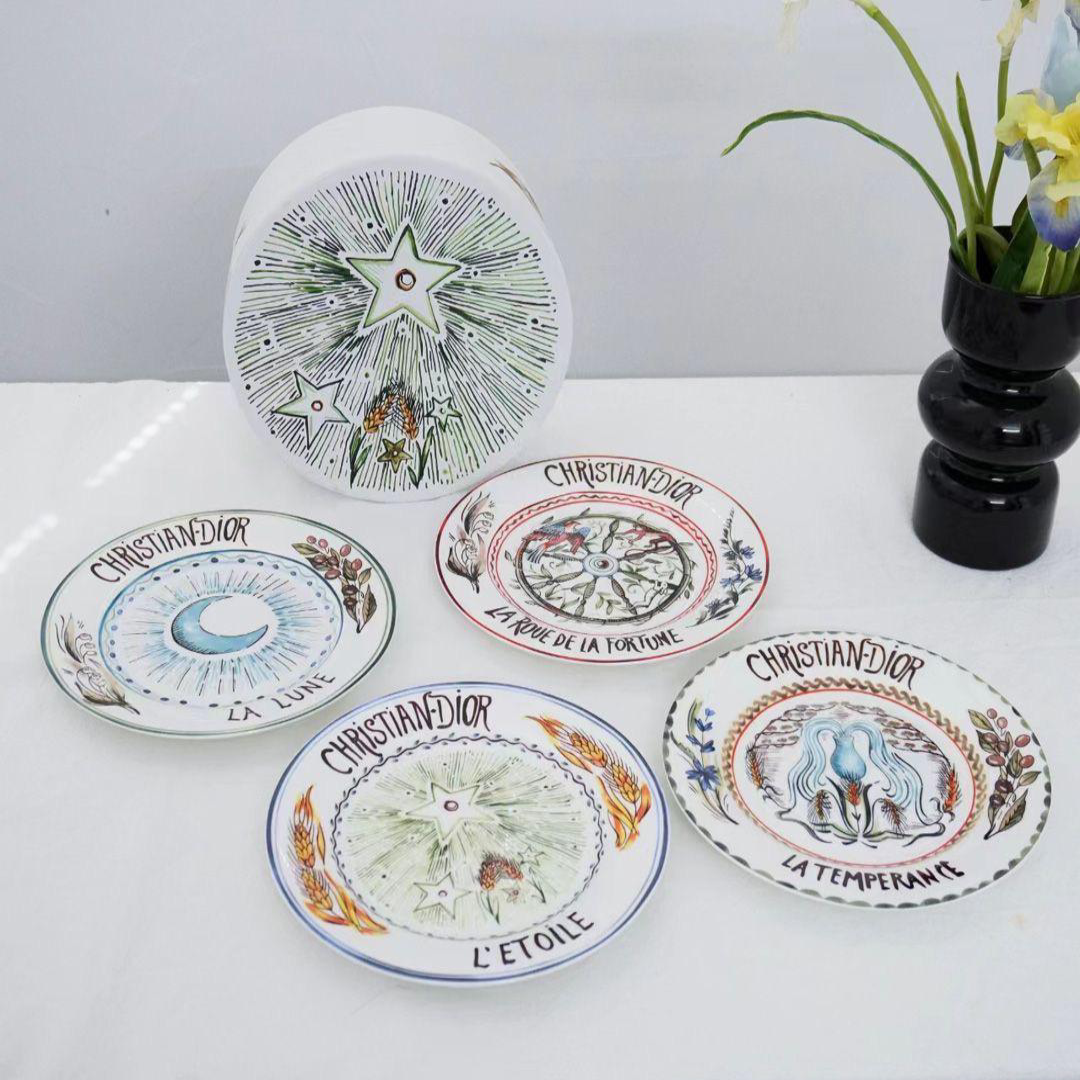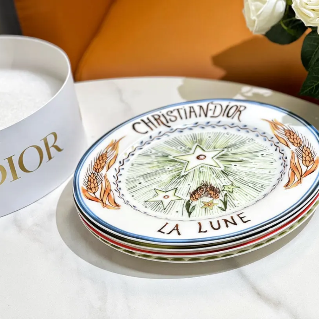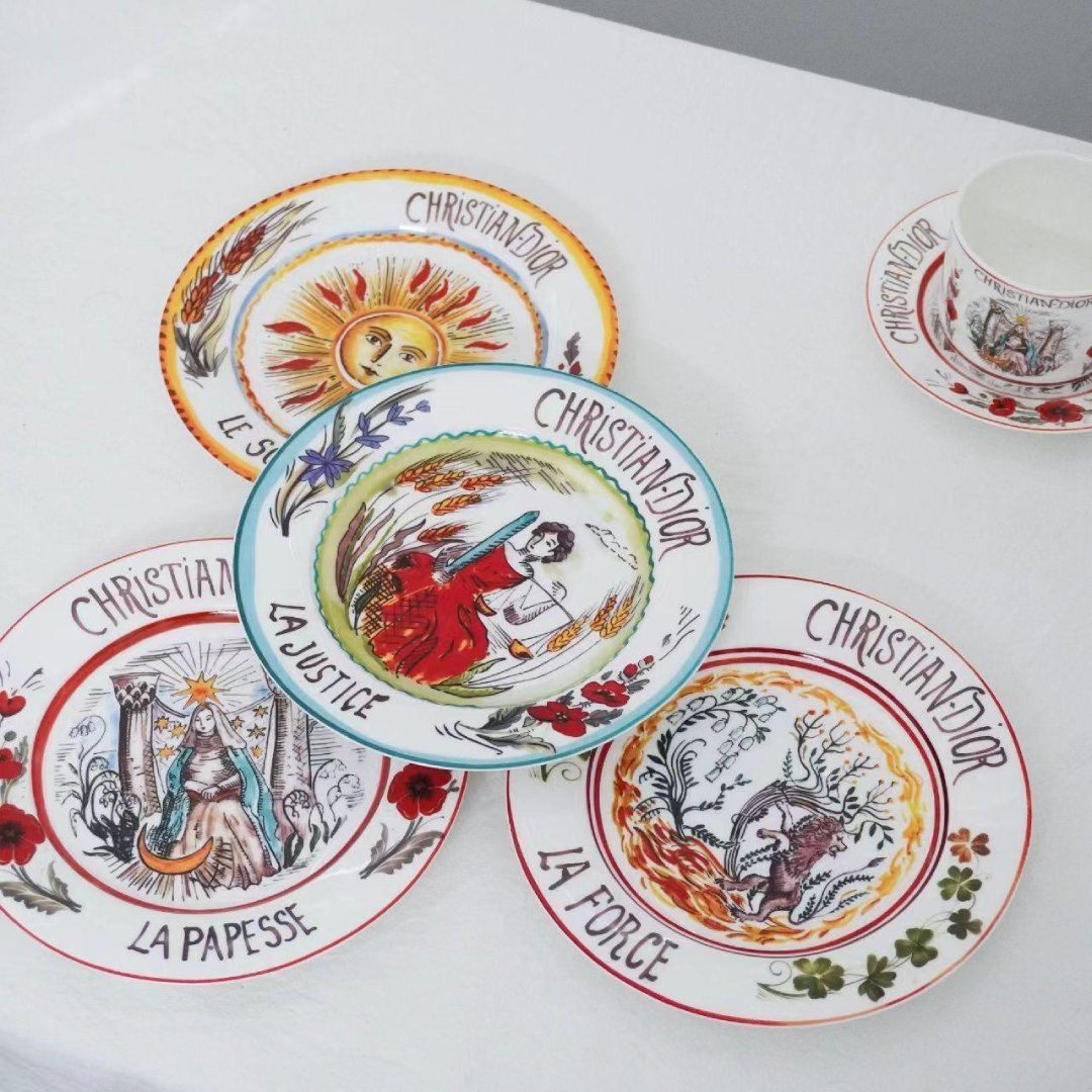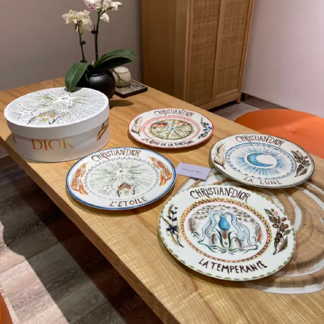 Christian Dior set of 8-inch & 10-inch Sun and Moon disks (4 pieces each) featuring vibrant, mystical Tarot-inspired hand-painted illustrations.
