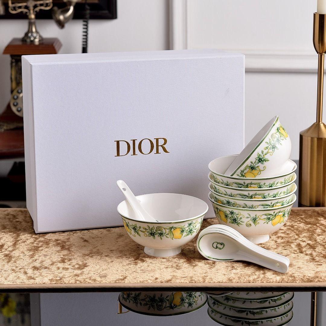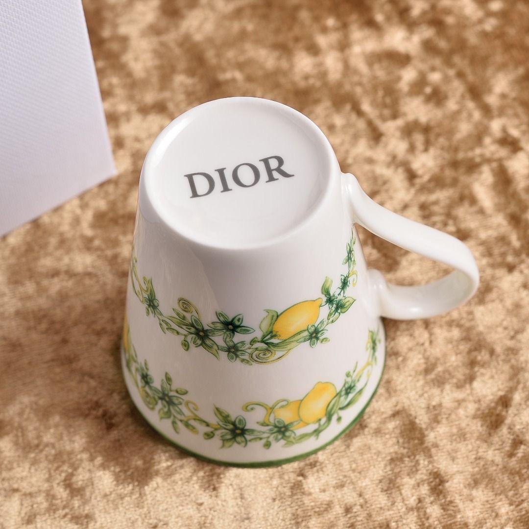 Elegant Dior porcelain tea sets and mugs featuring floral and lemon designs, beautifully packaged in luxurious white boxes.
