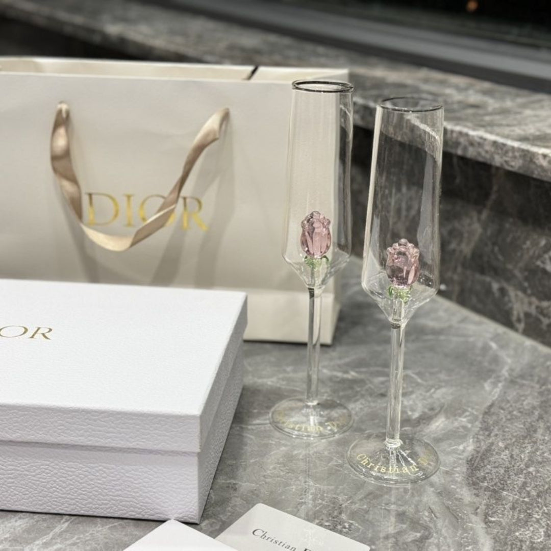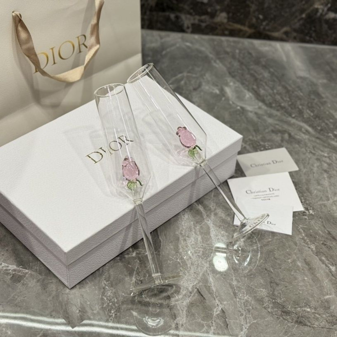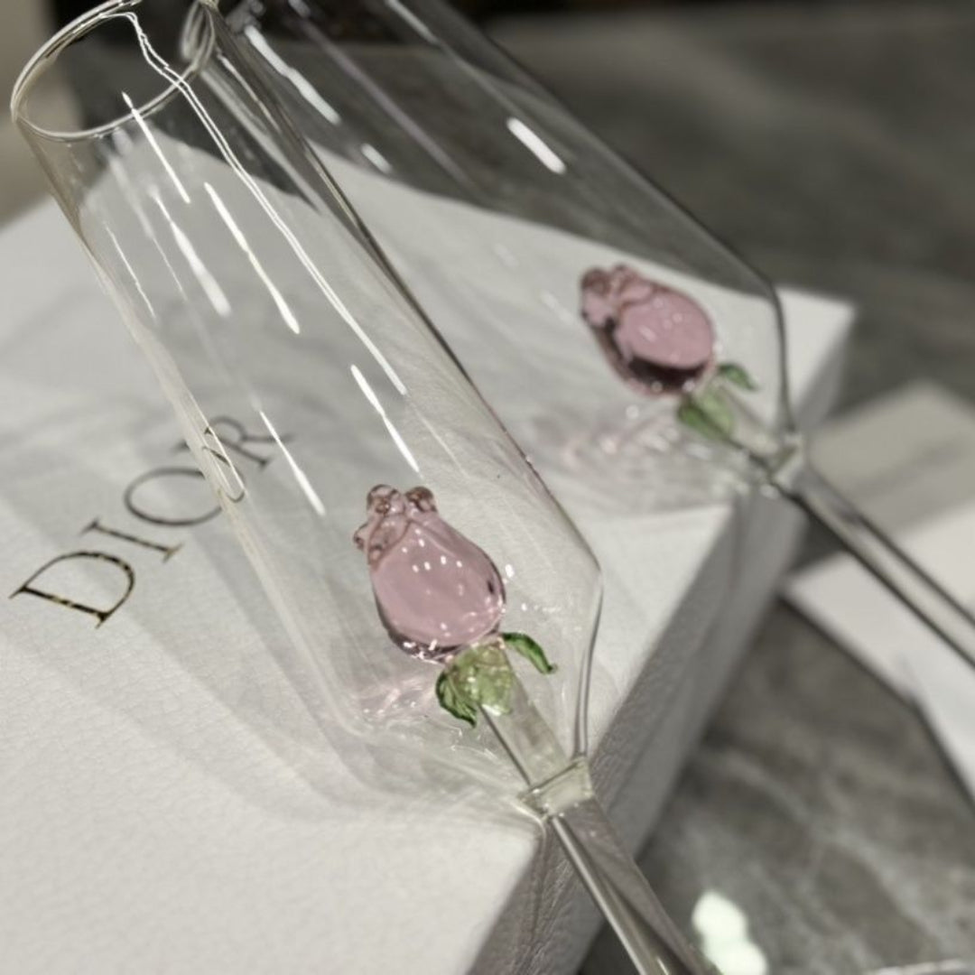 Elegant Dior champagne flutes featuring delicate pink rose details, presented in a luxury white box.