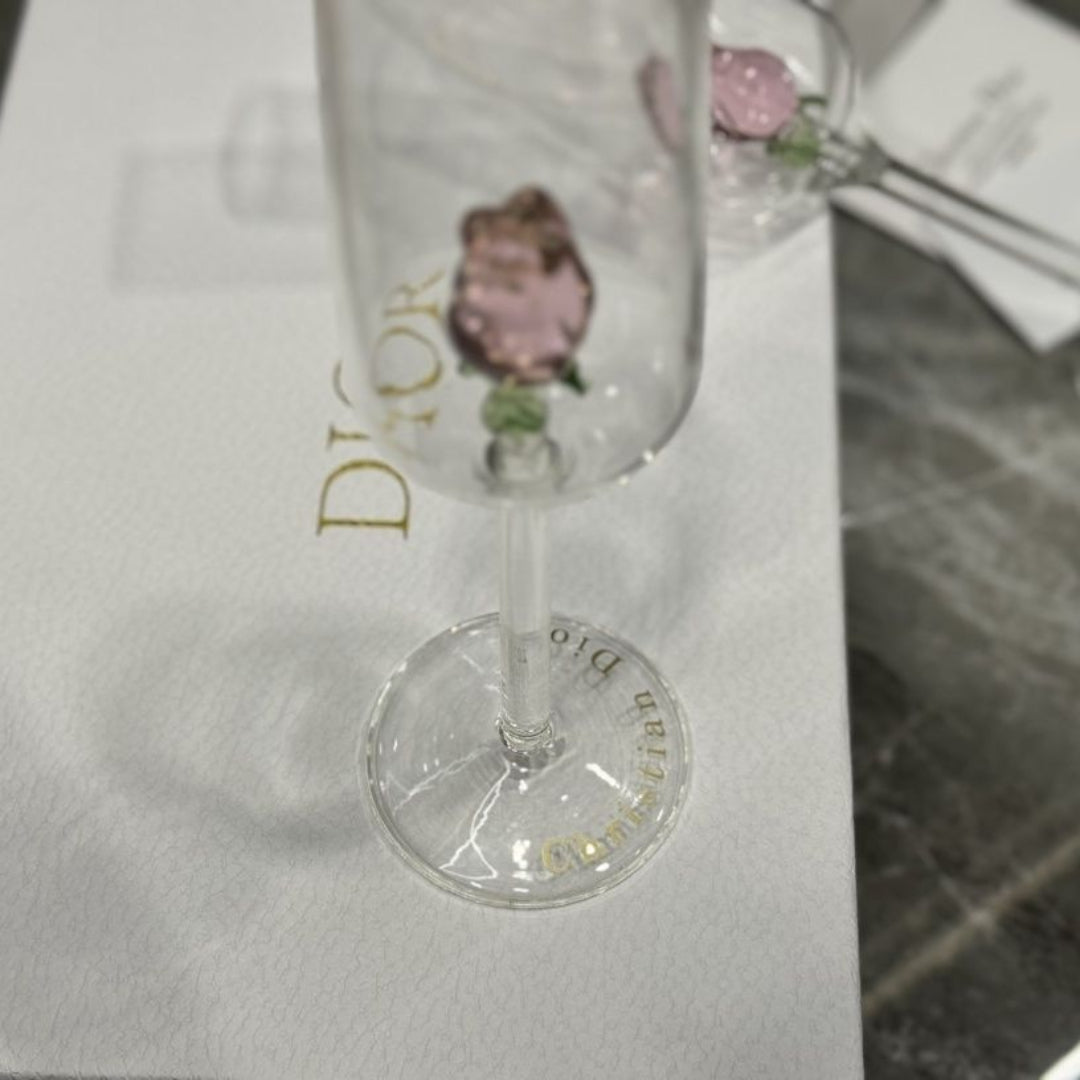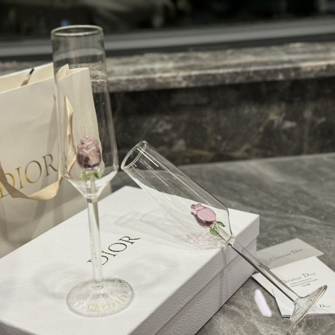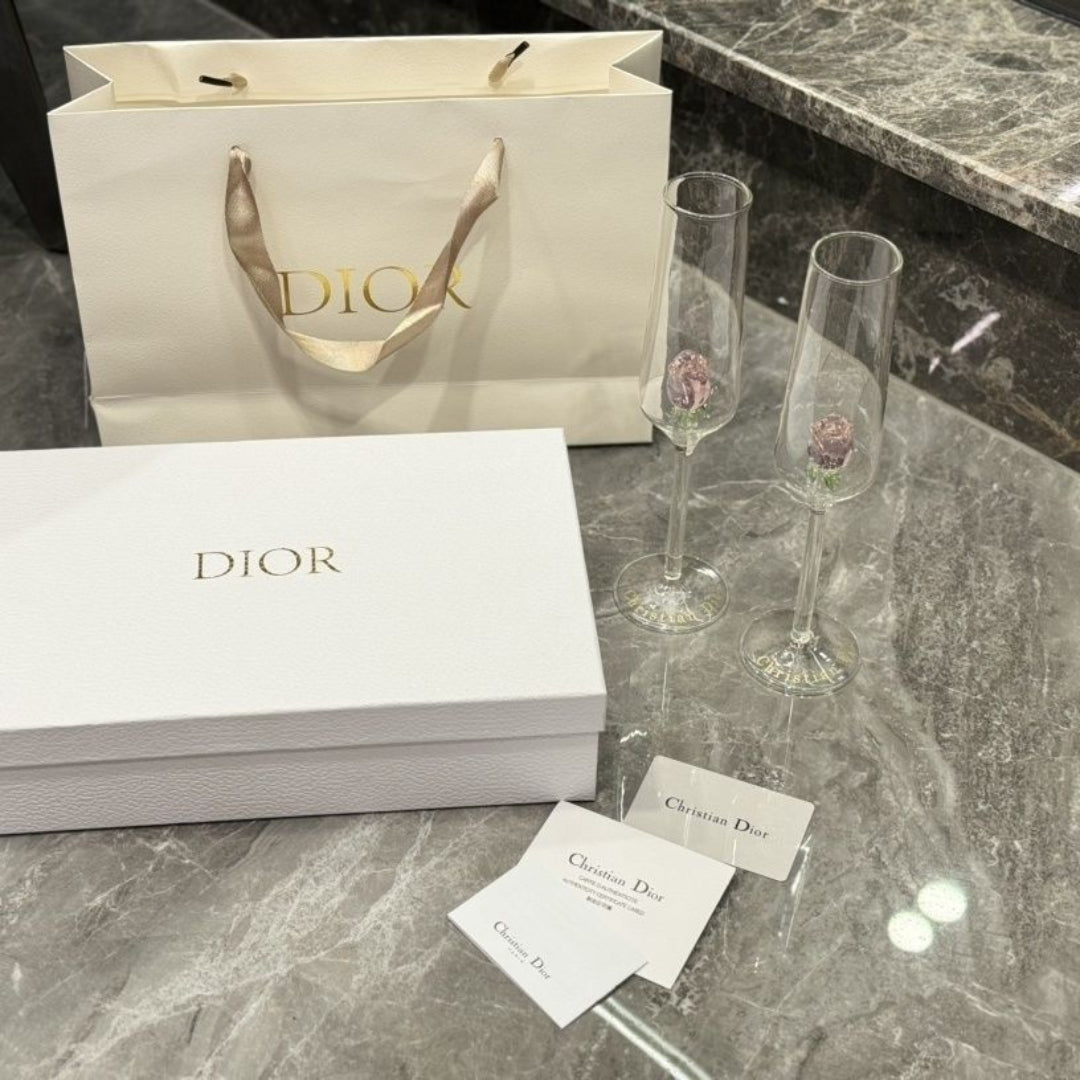 Elegant Dior champagne flutes featuring delicate pink rose details, presented in a luxury white box.