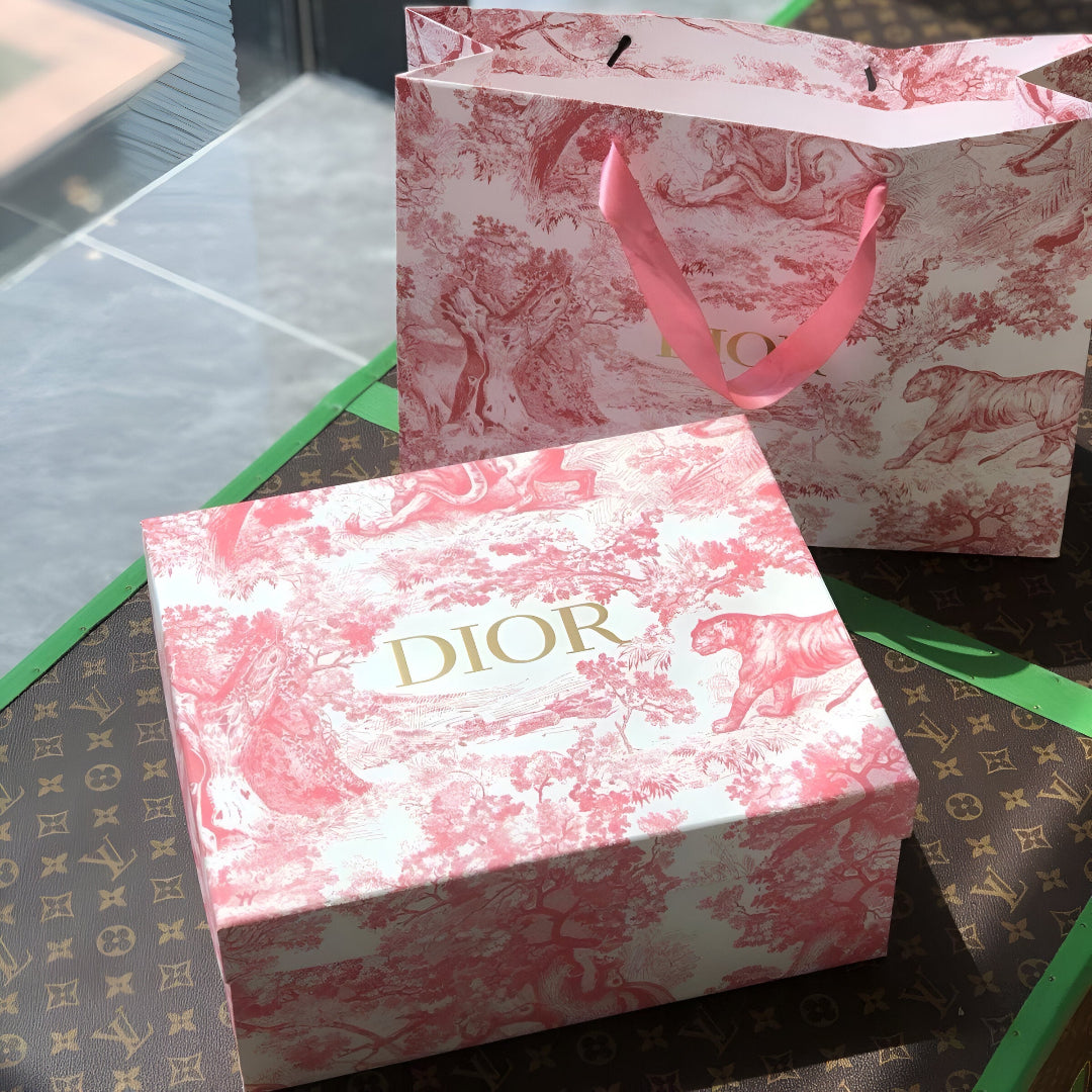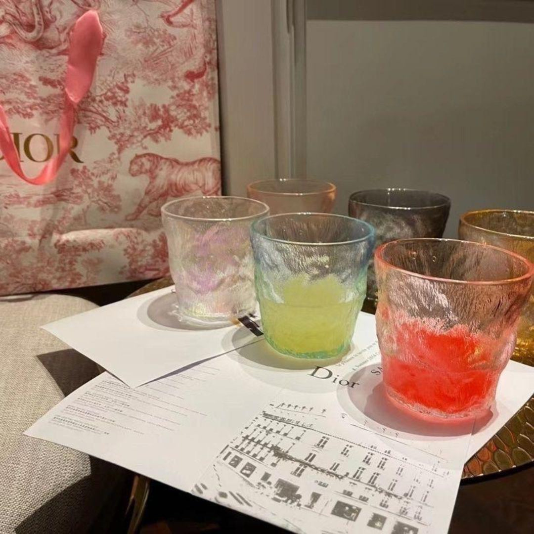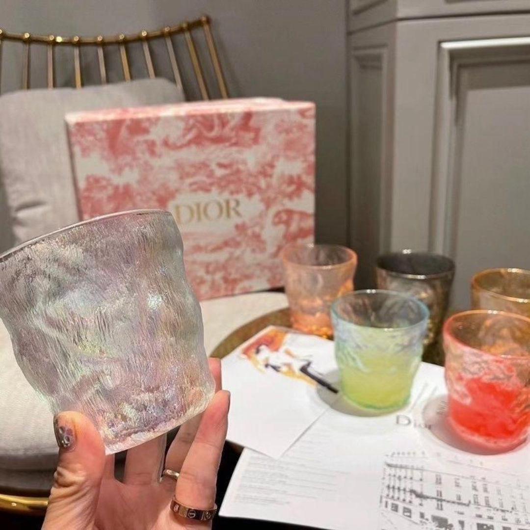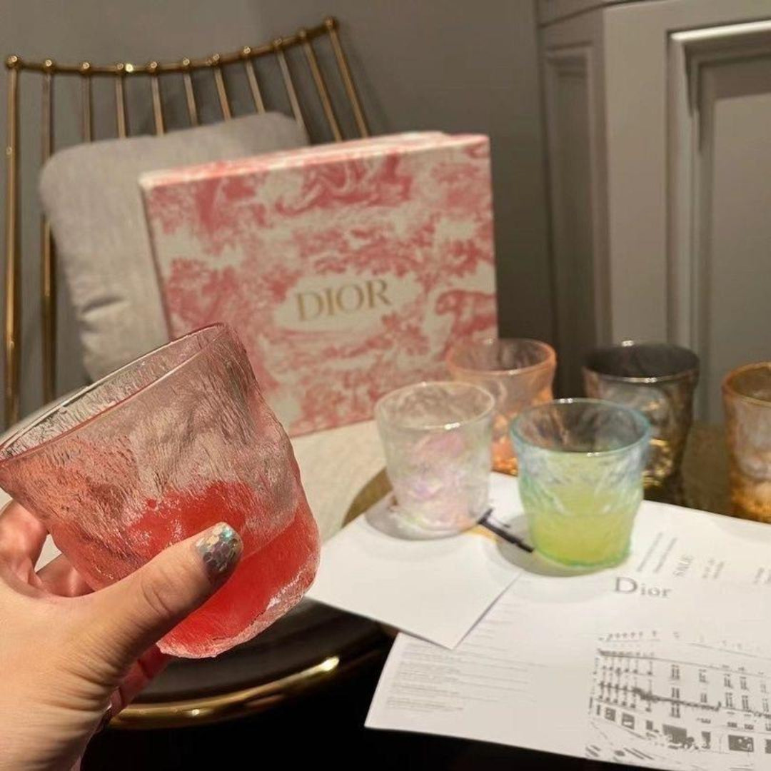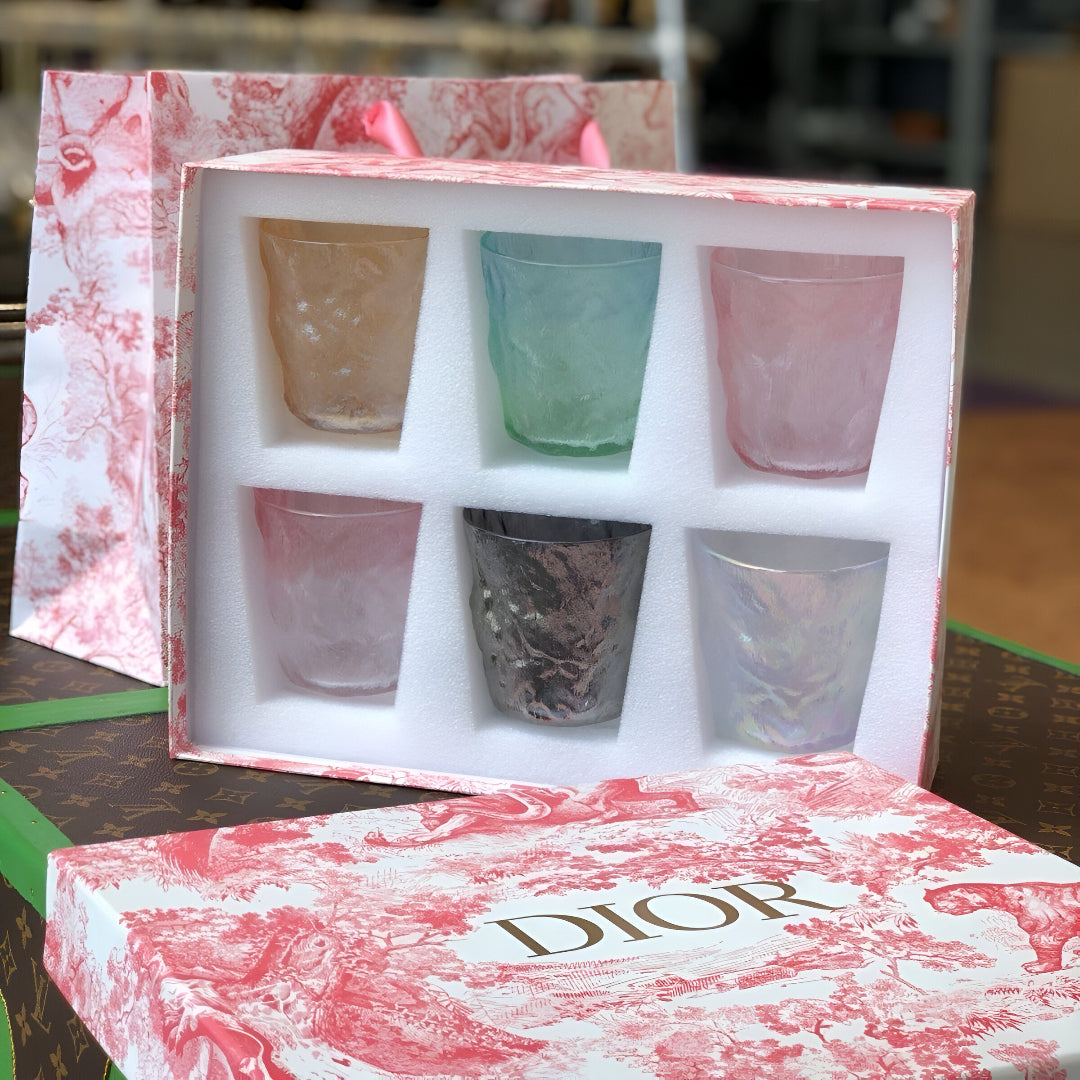 Luxurious Dior gift set featuring six textured, multicolor glass cups in an elegant toile-patterned box.