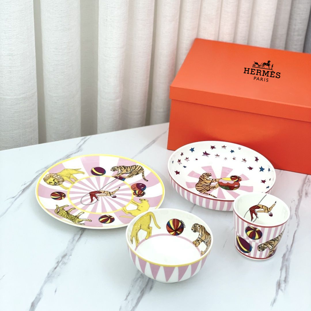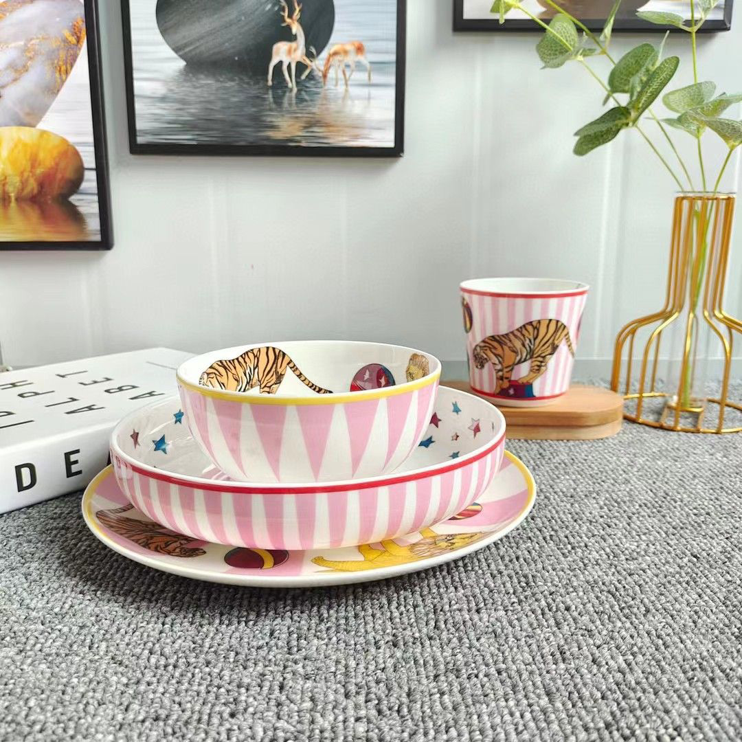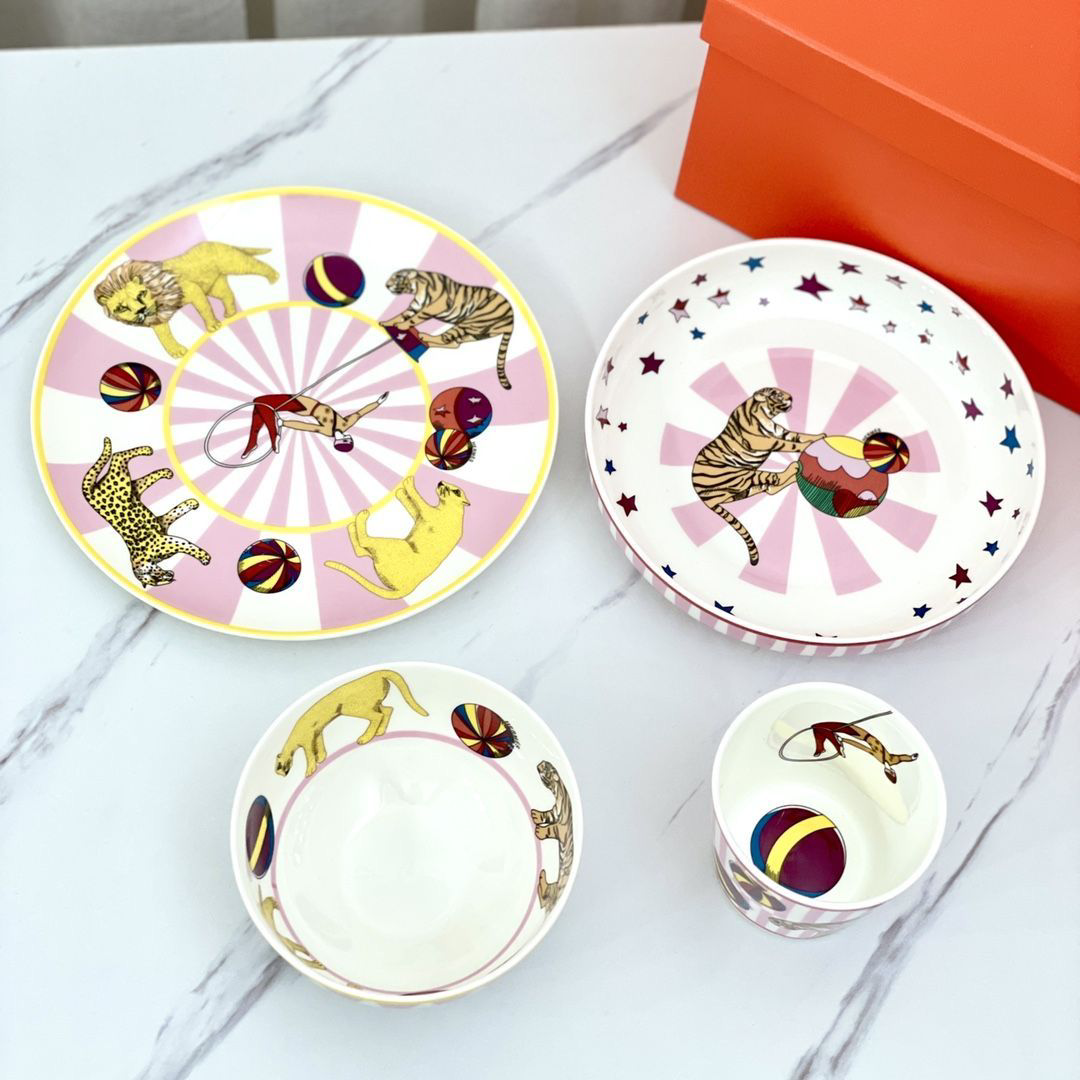 Playful Hermès porcelain dinnerware featuring circus-themed animal illustrations in a vibrant, artistic design.
