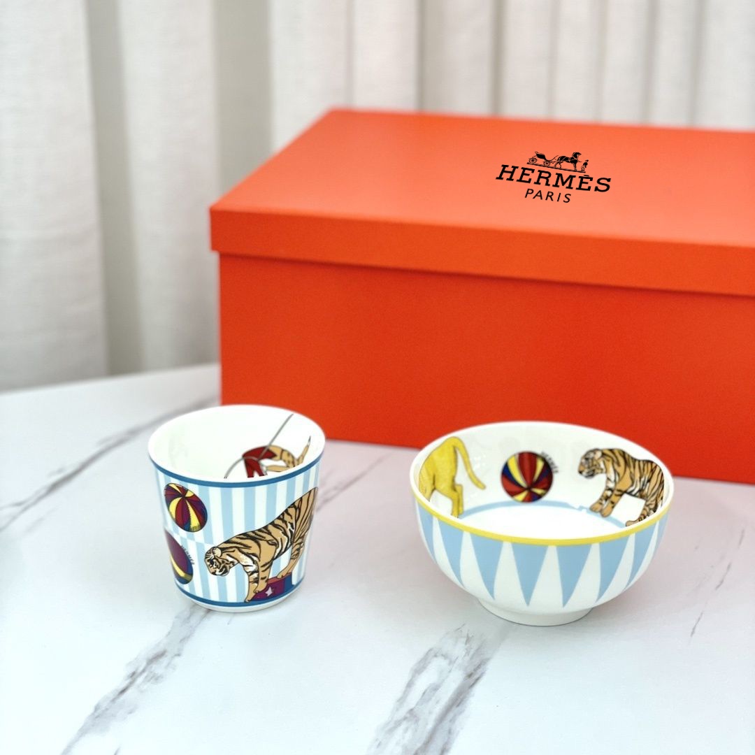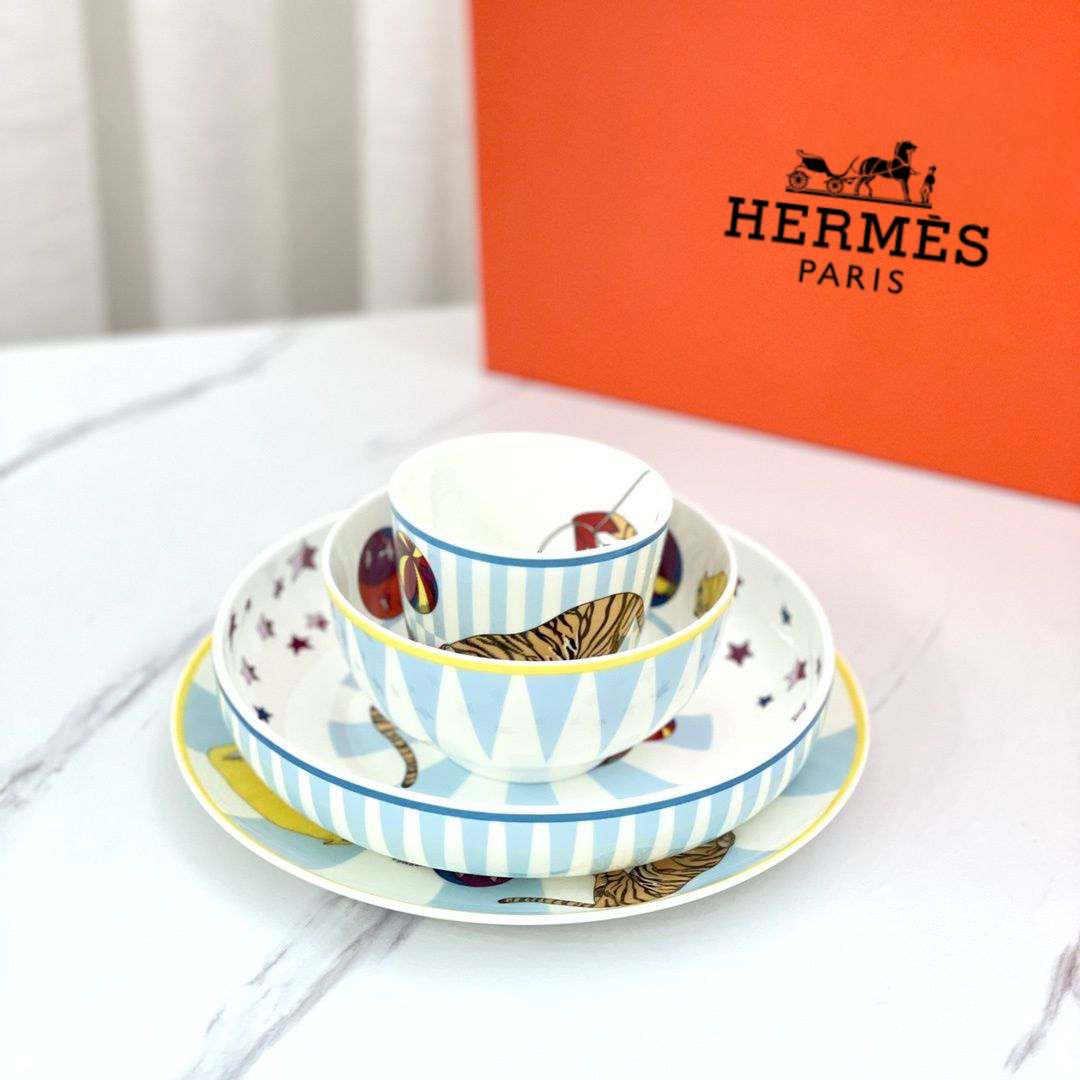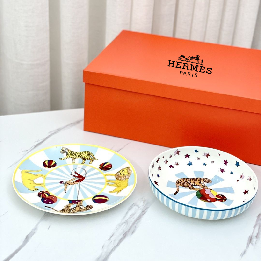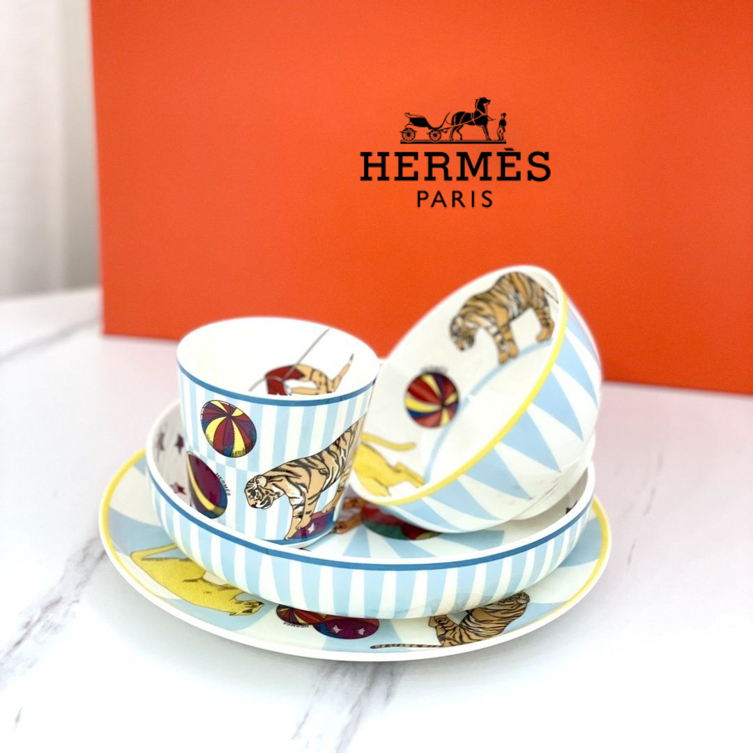 Playful Hermès porcelain dinnerware featuring circus-themed animal illustrations in a vibrant, artistic design.