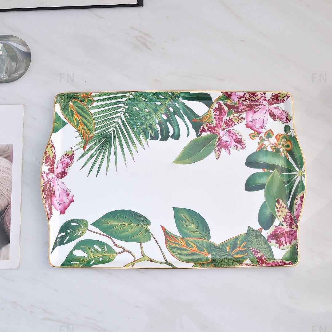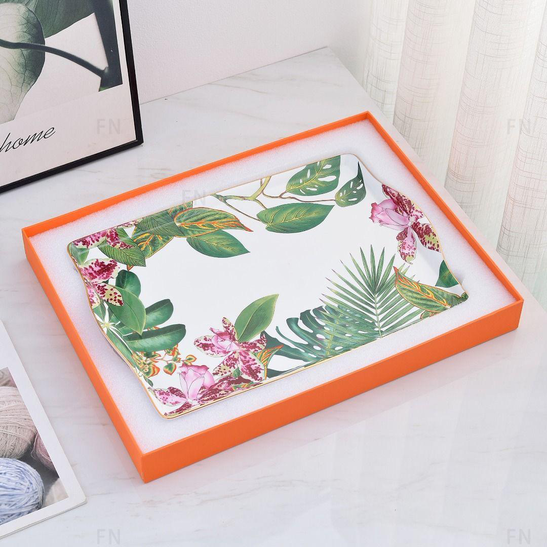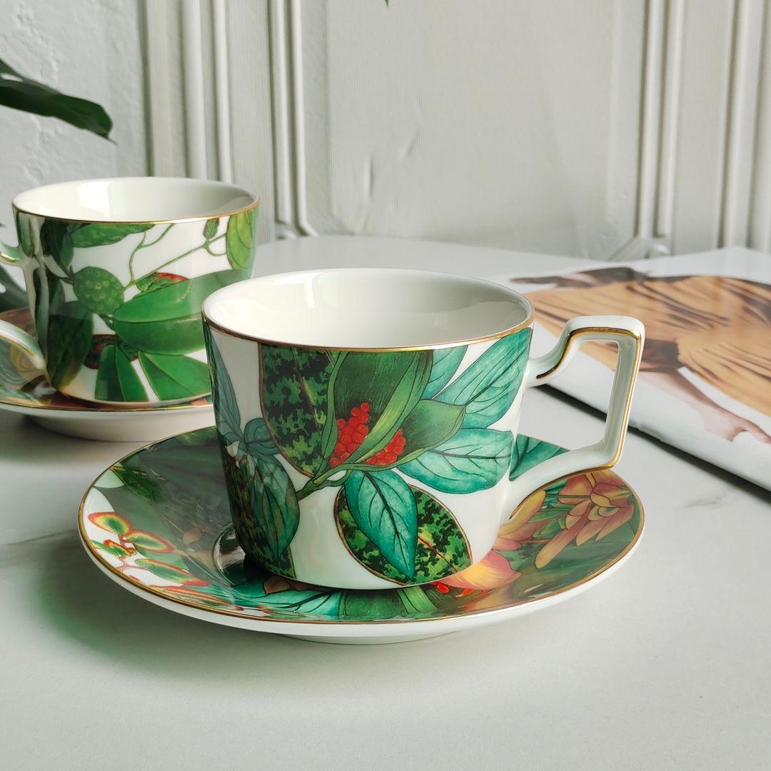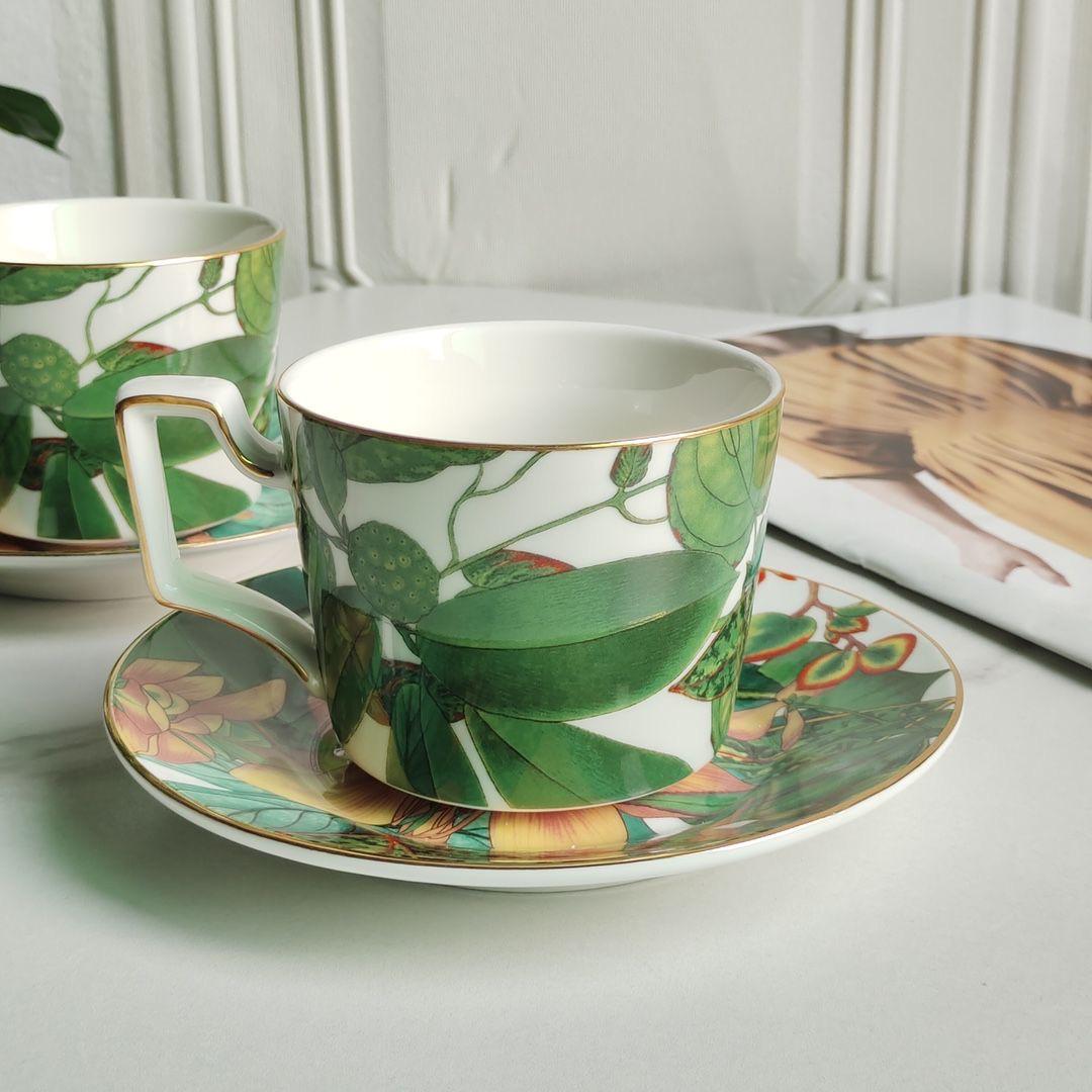 Hermès luxury floral porcelain tea set featuring vibrant tropical botanical designs, elegantly boxed.