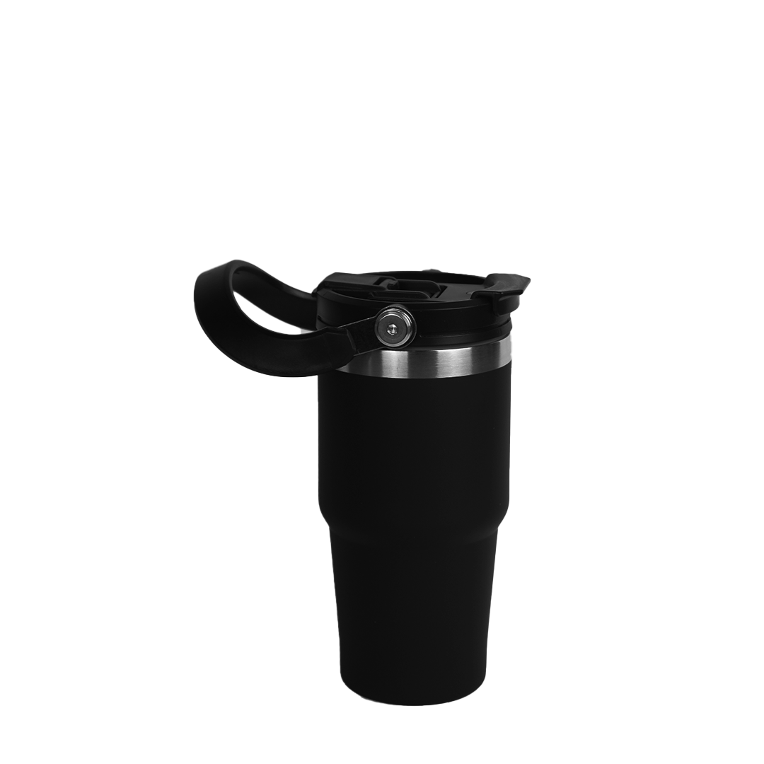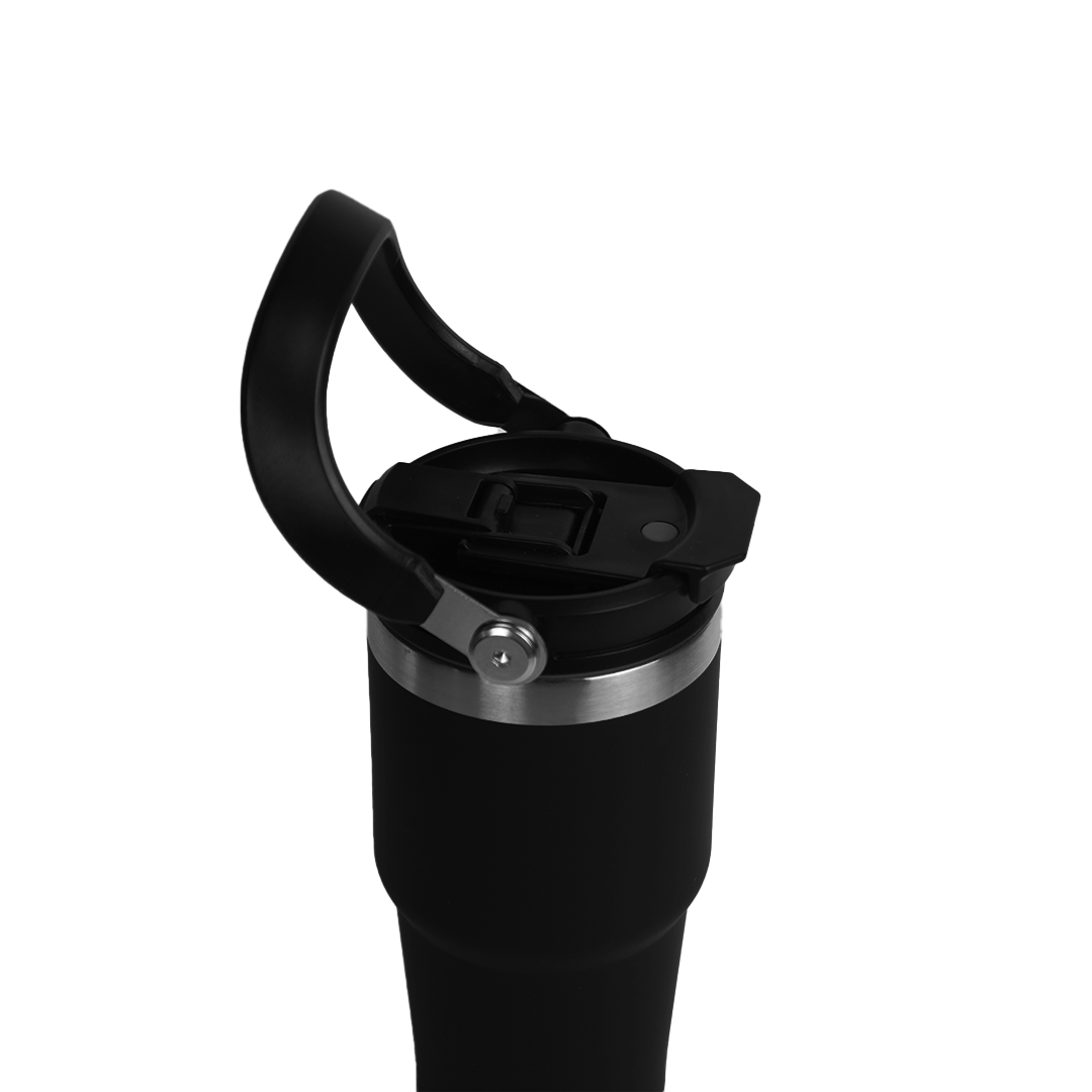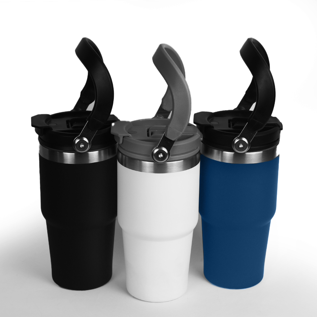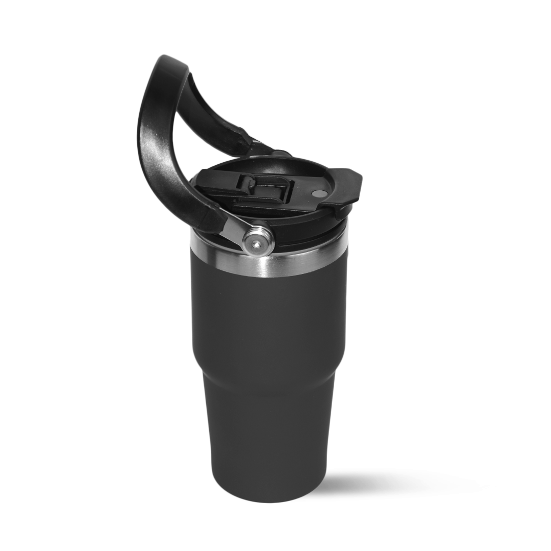 A sleek 600ml double-wall insulated mug designed for everyday comfort. Flip-open lid, sturdy handle, and stainless-steel accents. Comes in black, white, and blue.