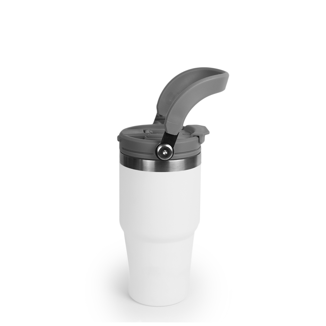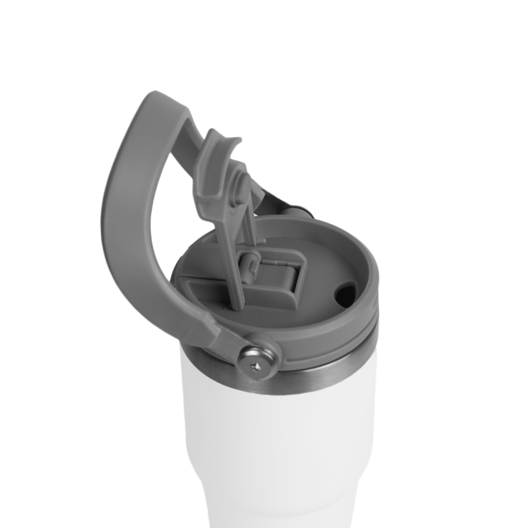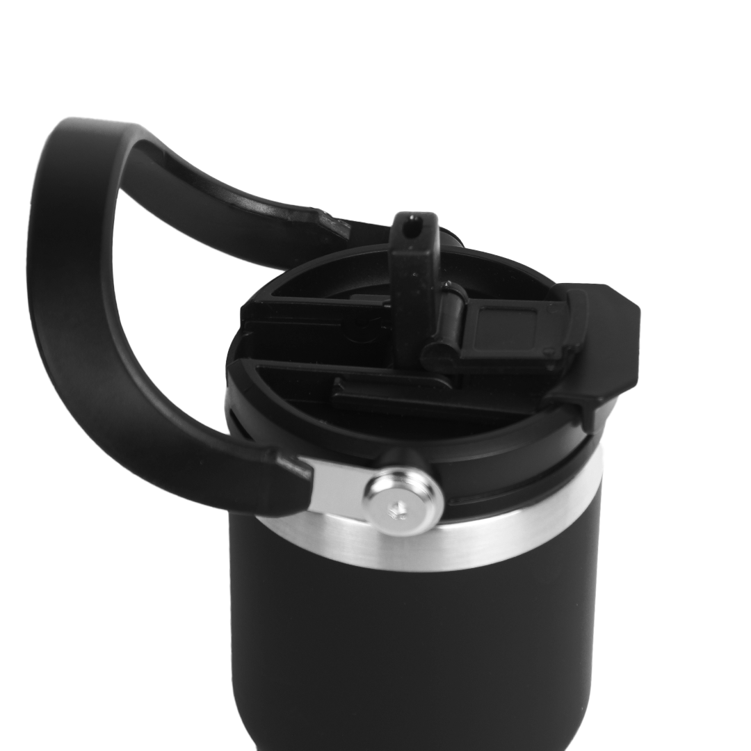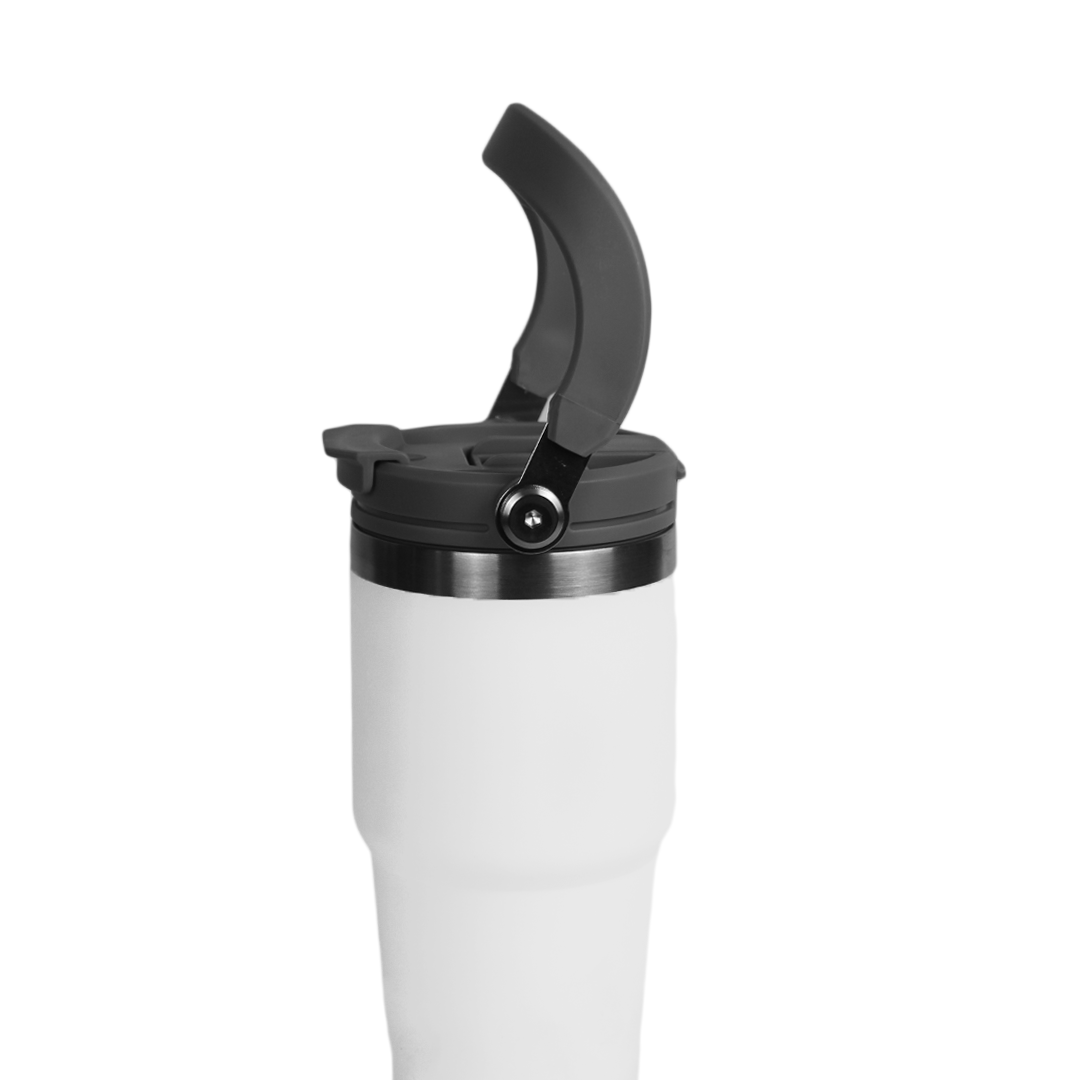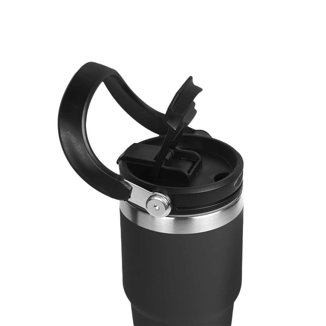 A sleek 600ml double-wall insulated mug designed for everyday comfort. Flip-open lid, sturdy handle, and stainless-steel accents. Comes in black, white, and blue.