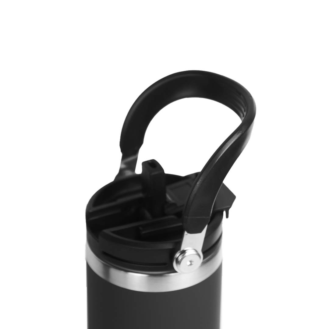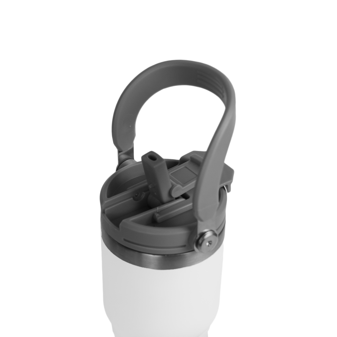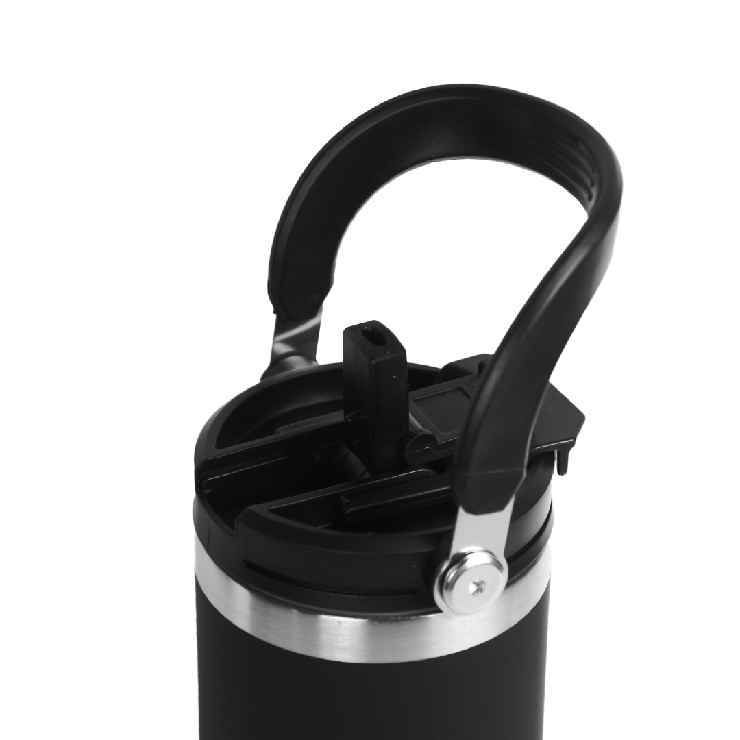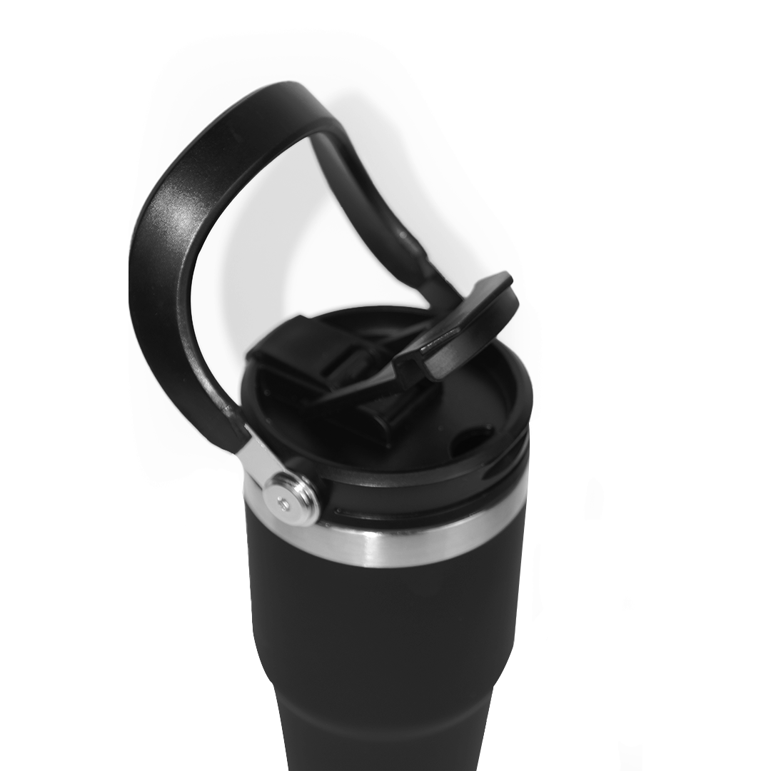 A sleek 600ml double-wall insulated mug designed for everyday comfort. Flip-open lid, sturdy handle, and stainless-steel accents. Comes in black, white, and blue.