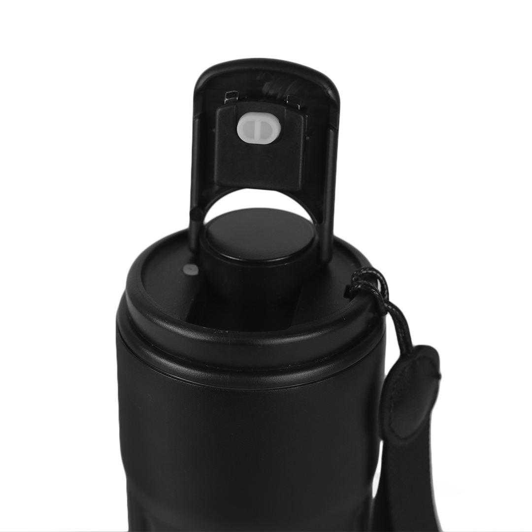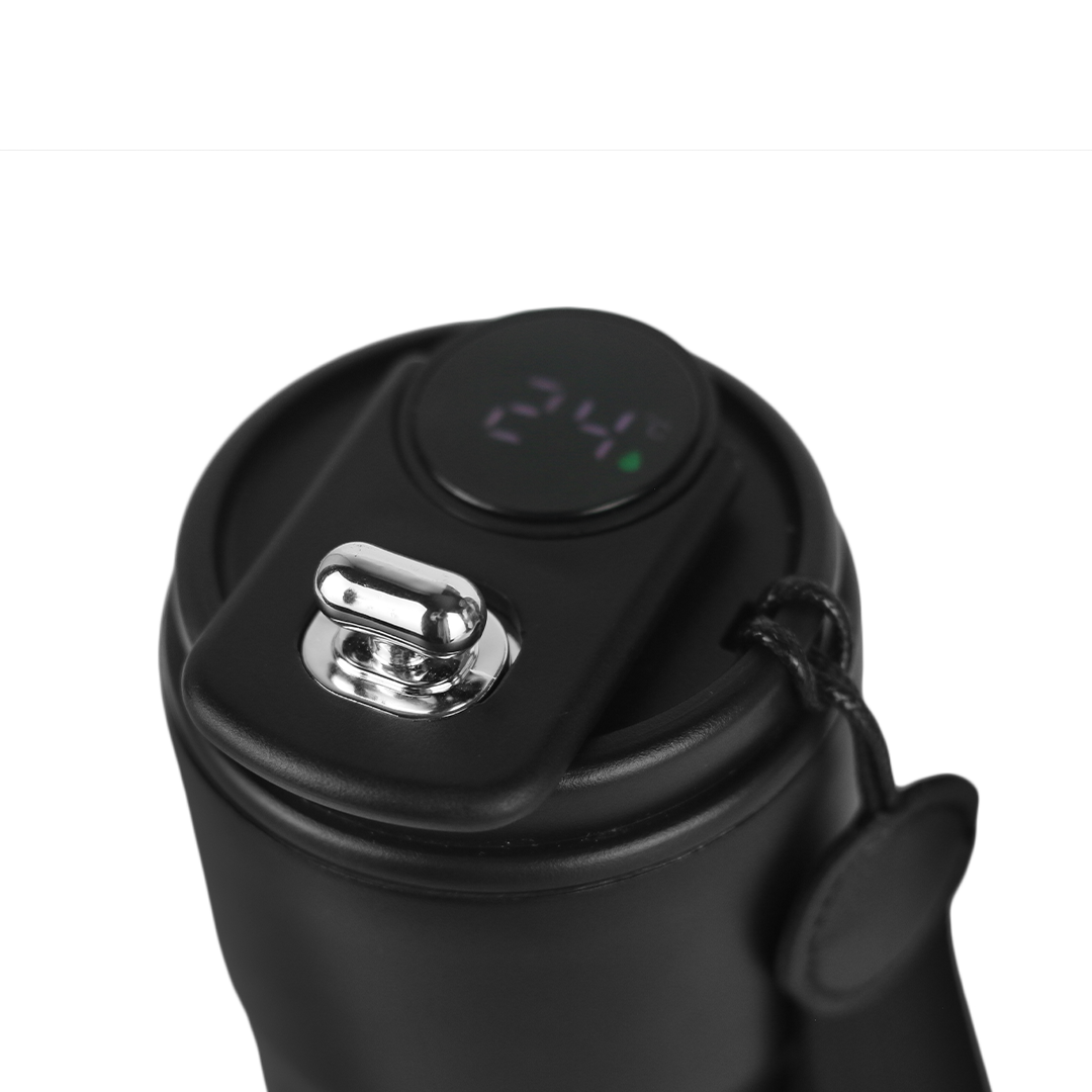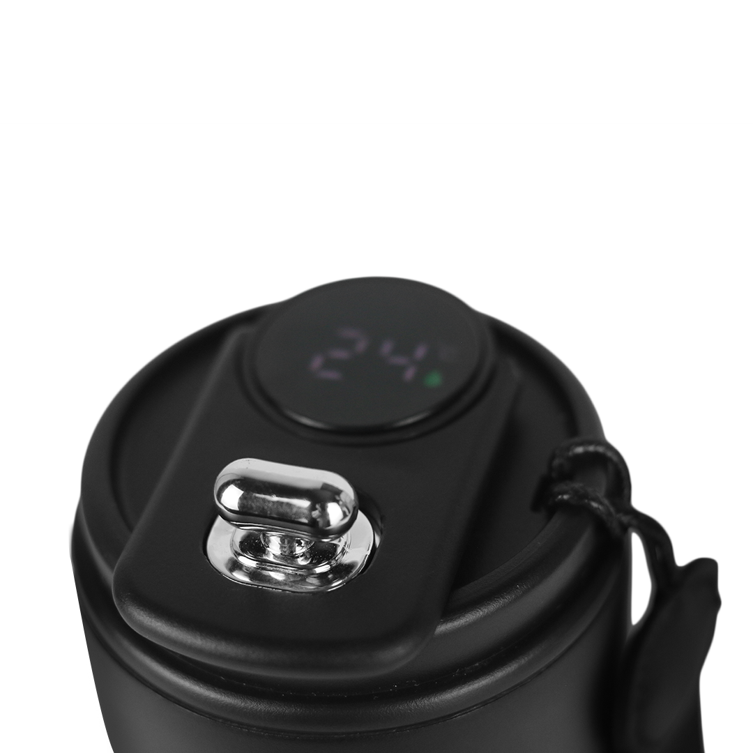 Smart insulated mug with LED temperature display, secure flip-top lid, and wrist strap. Keeps drinks hot or cold for hours with a durable, sleek matte finish.