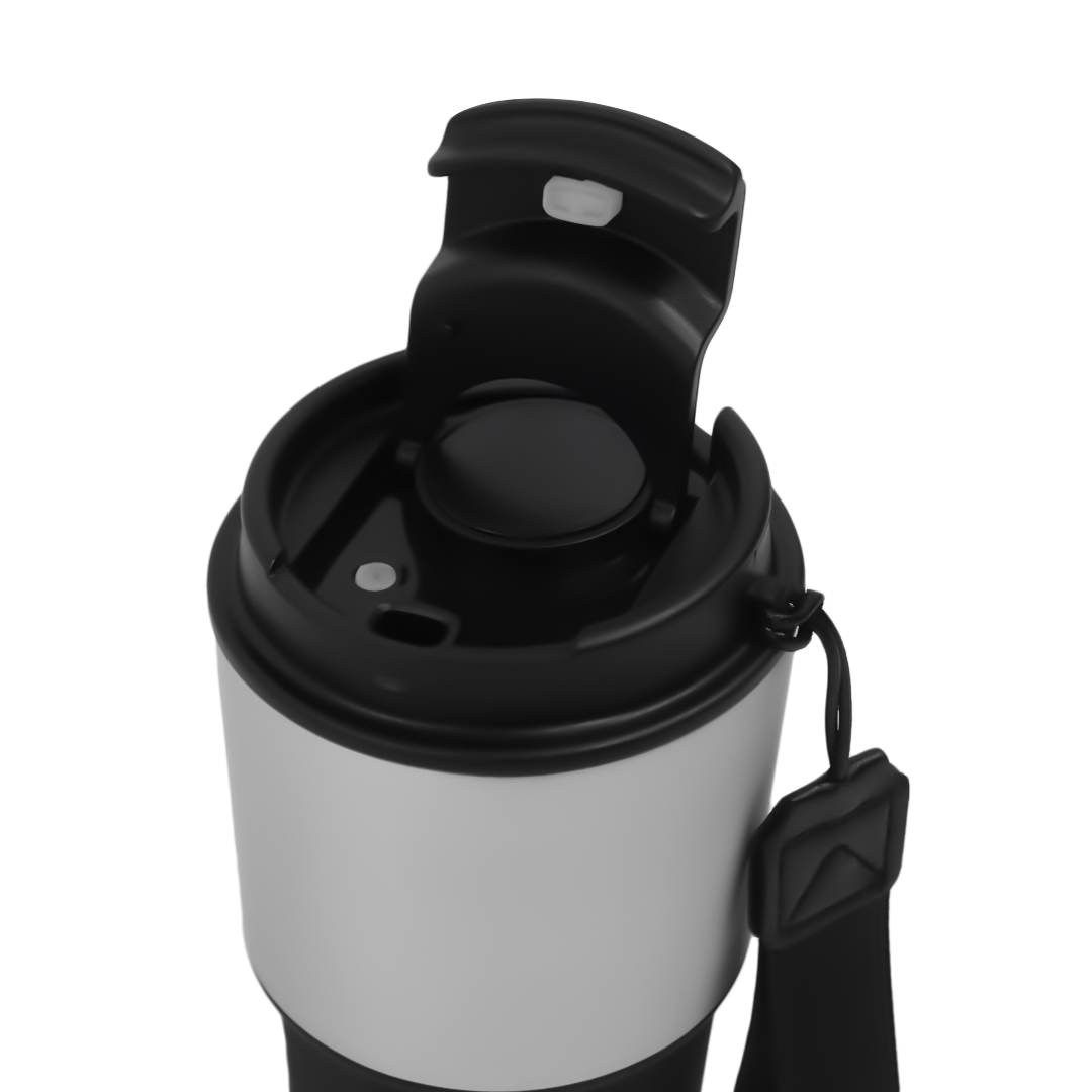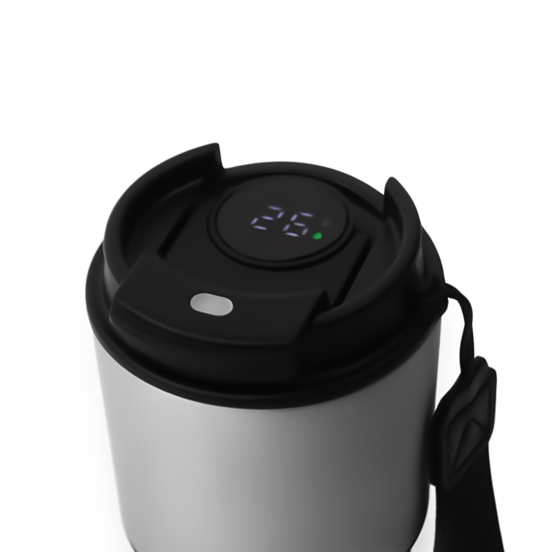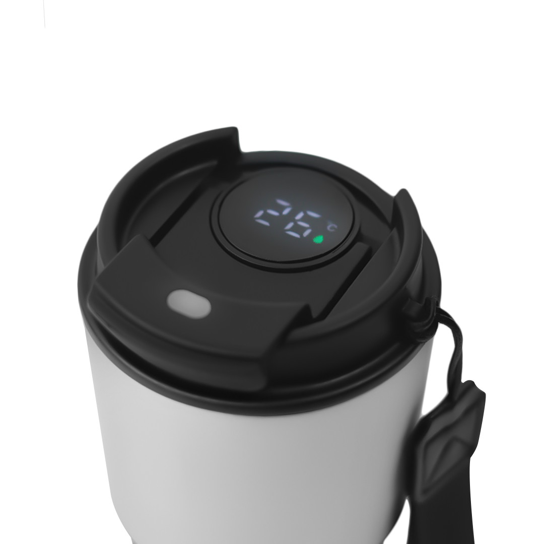 480ml insulated smart mug with LED temperature display, flip-top lid, and a durable wrist strap. Perfect for hot or cold drinks at home, work, or on the go.