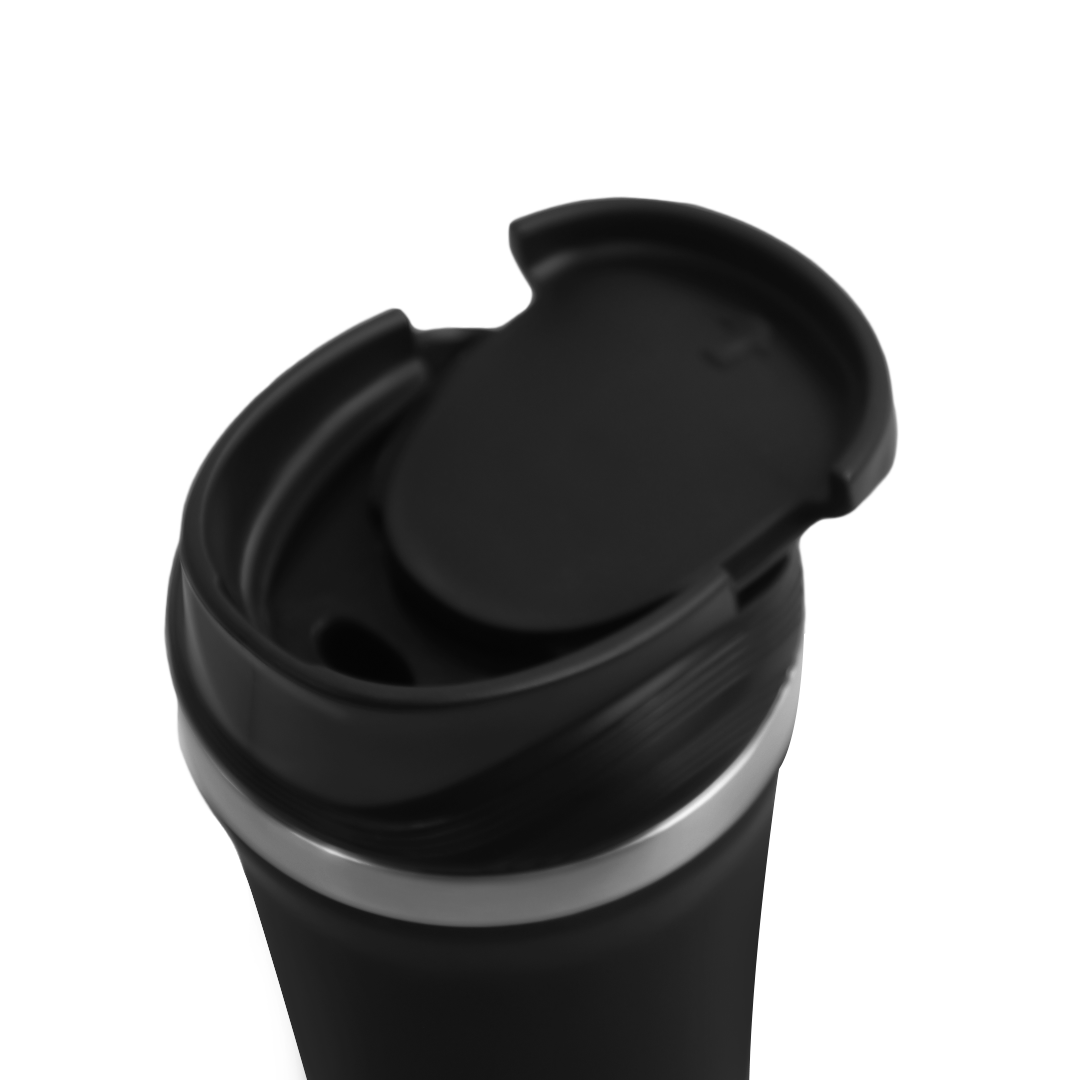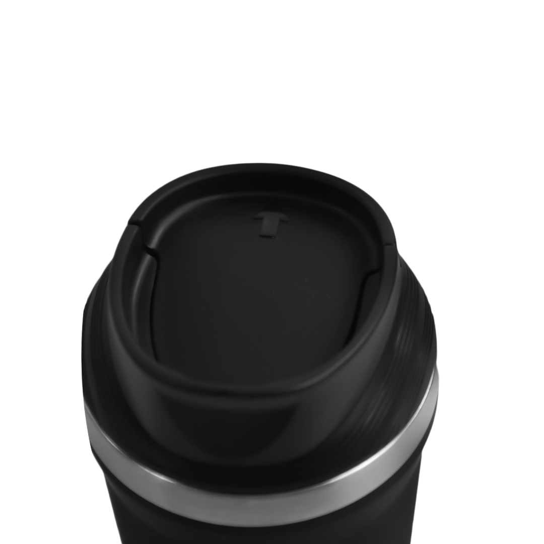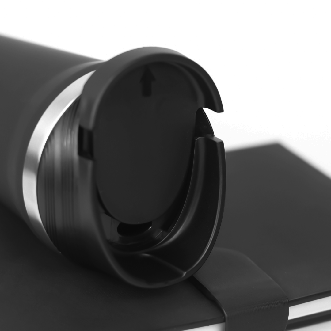 350ml suction mug with non-slip base, secure flip lid, and insulated design. Perfect for home, office, and travel. Available in black and blue.