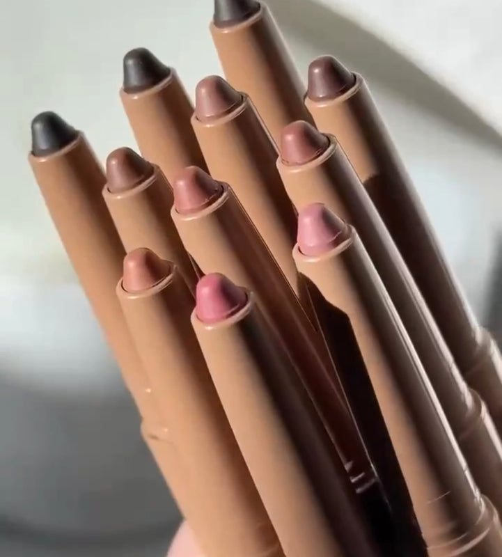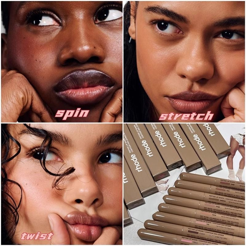A collection of Rhode Lip Liner pencils in various shades. These lip pencils are designed to define and shape the lips while likely containing peptides for a smoothing effect.